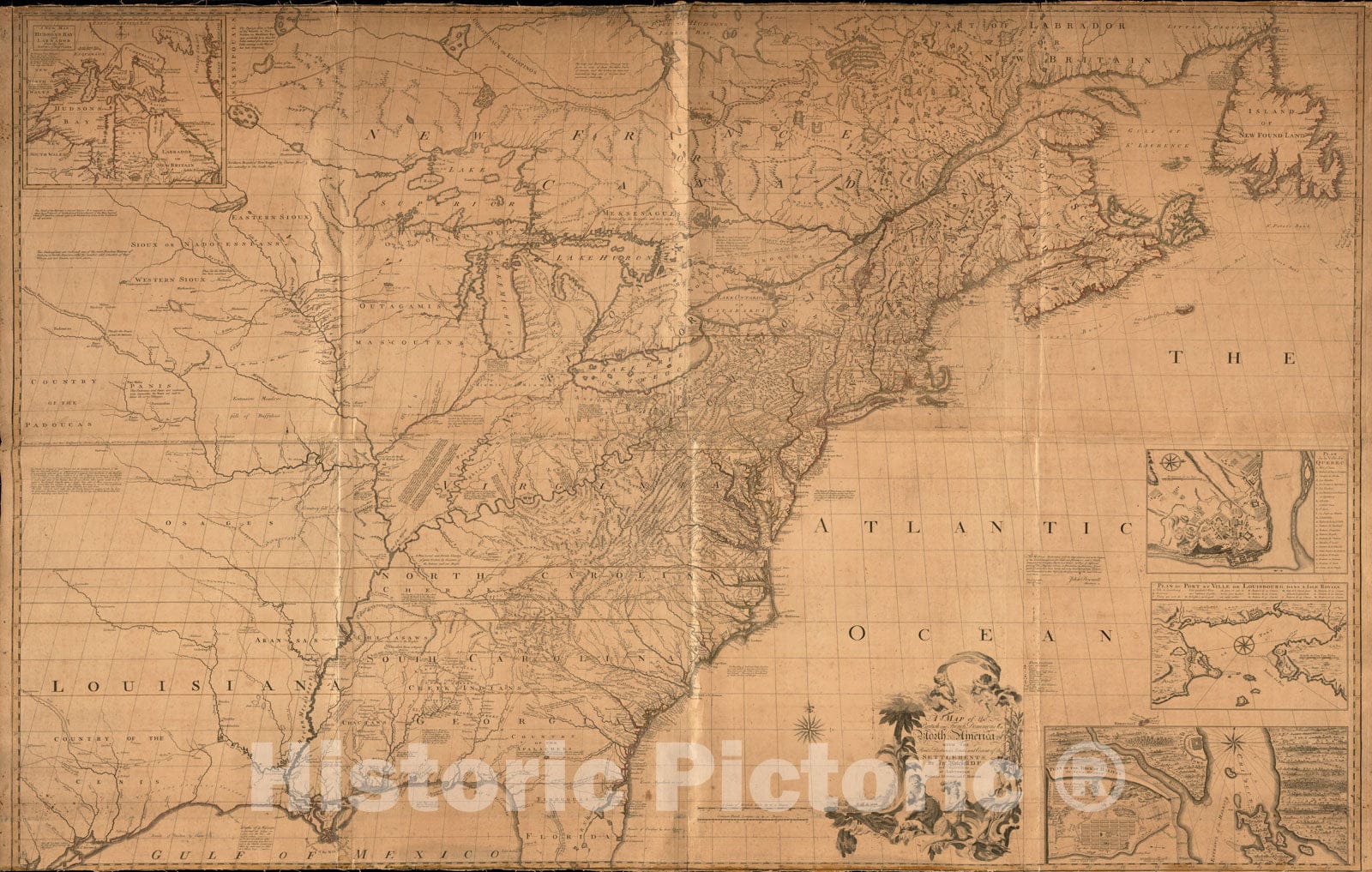 • Historical Map, 1755-1761 A map of the British and French dominions in North America : with the roads, distances, limits, and extent of the settlements, Vintage Wall Art