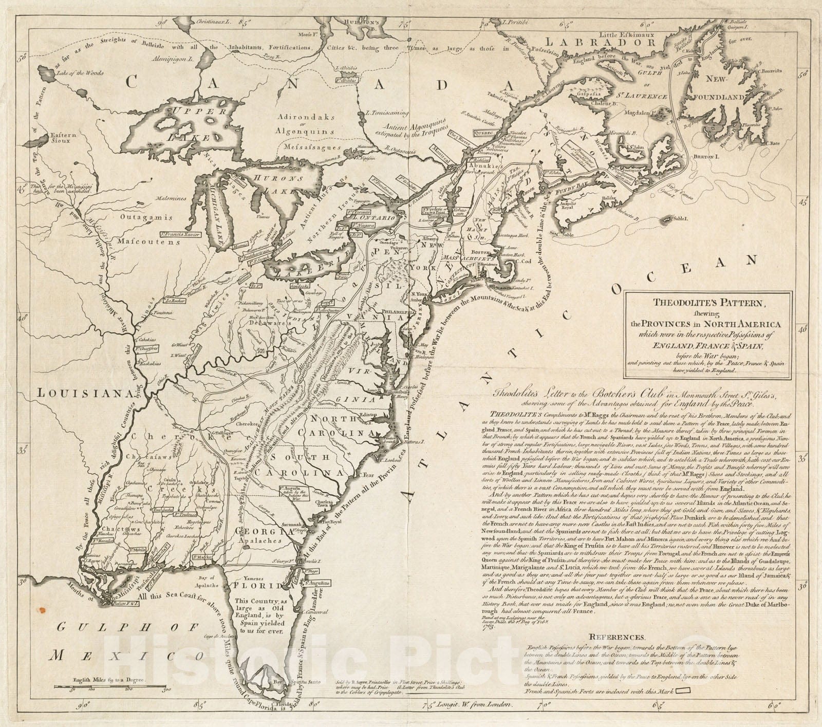 Historical Map, 1763 Theodolite's Pattern, shewing The Provinces in North America which were in The respective Possessions of England, France & Spain, Vintage Wall Art