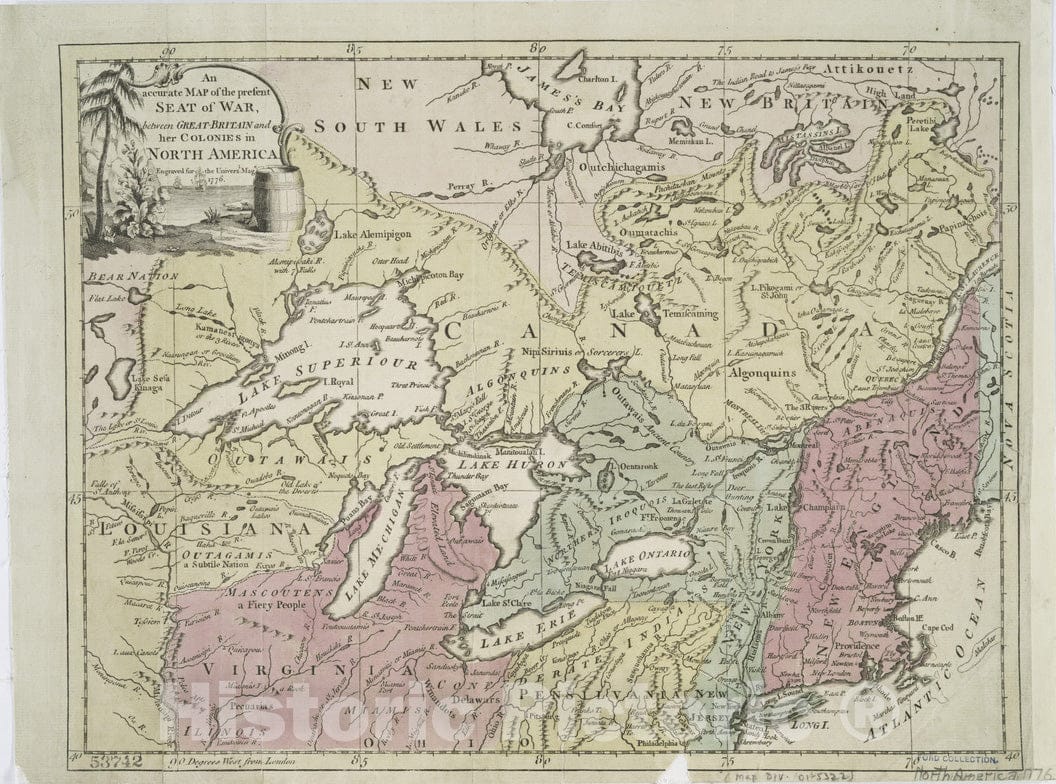 Historical Map, 1776 an Accurate map of The Present seat of war Between Great-Britain and her Colonies in North America, Vintage Wall Art