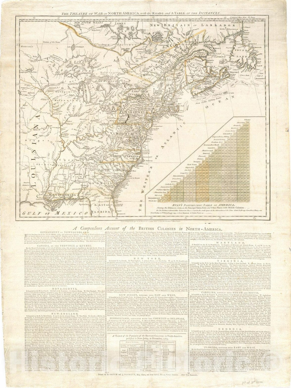 Historical Map, 1776 The Theatre of war in North America, with The Roads and a Table of The Distances, Vintage Wall Art