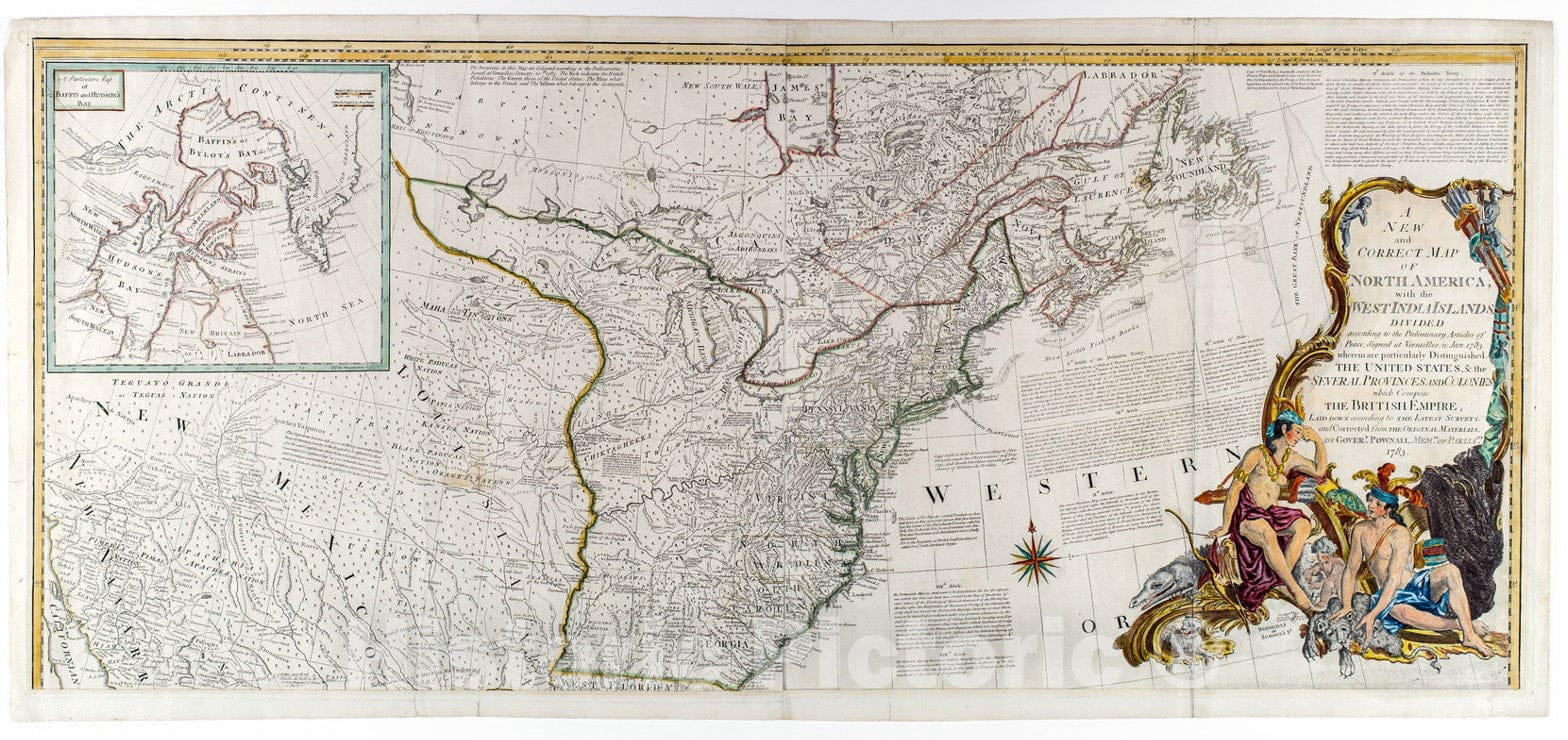 A new and correct map of North America, with the West India islands, divided according to the preliminary articles of peace, signed at Versailles, 20 Jan. 1783, wherein are particularly distinguished the United States, & the several provinces and colonies, which compose the British empire : laid down according to the latest surveys, and corrected from the original materials, of Goverr. Pownall, membr. of Parliamt. 1783