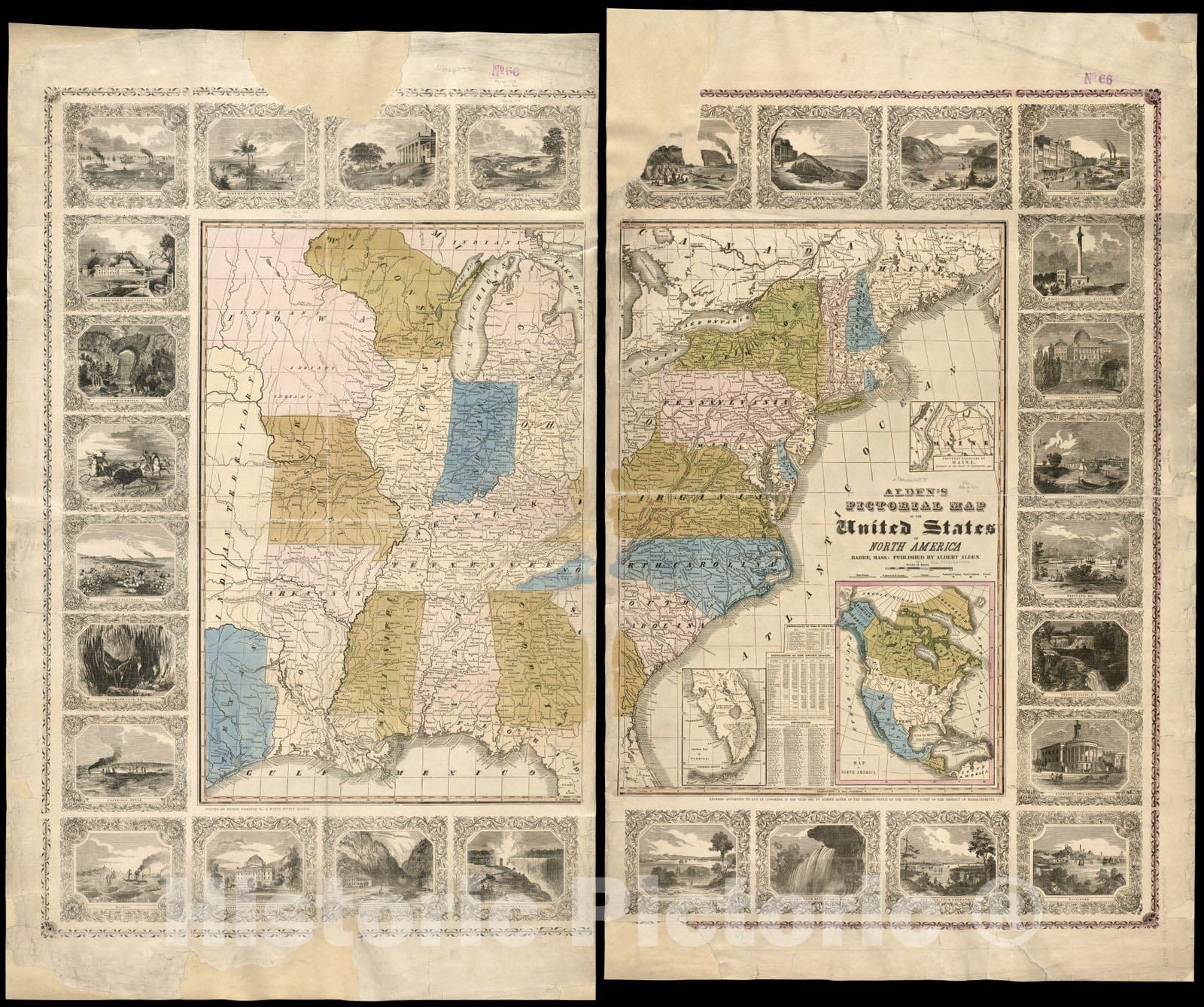 Historical Map, 1845 Alden's pictorial map of the United States of North America, Vintage Wall Art