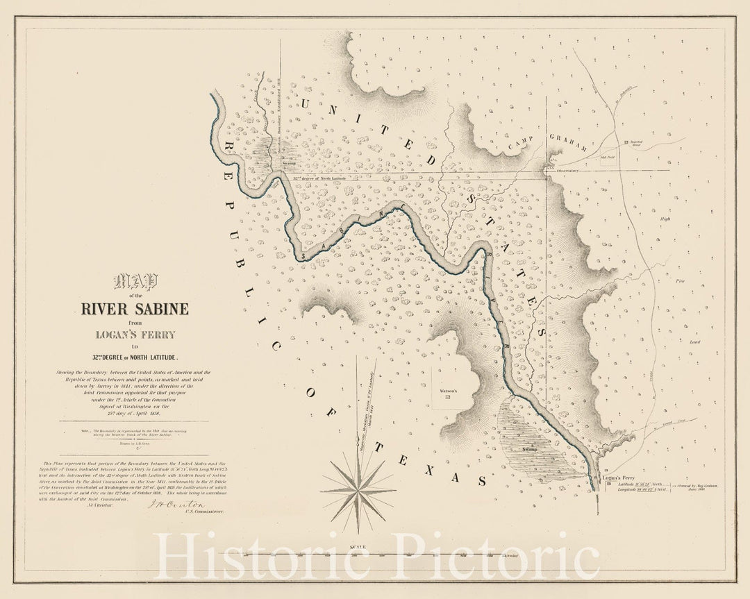 Historical Map, 1842 Map of The River Sabine from Logan's Ferry to 32nd Degree of North Latitude : shewing The Boundary Between The United States of America, Vintage Wall Art