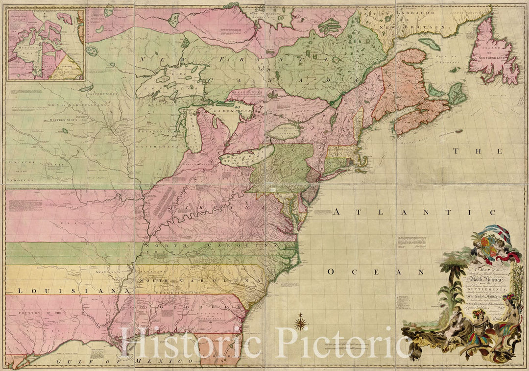 Historic 1755 Map - A map of The British and French dominions in North America, with The Roads, Distances, Limits, and Extent of The settlements