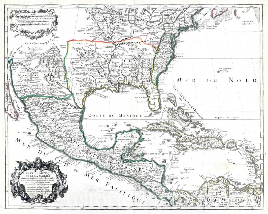 Historic Wall Map : Mexico; United States, , North America; West Indies 1708 Mexique, Floride, Terres Angloises, Isles Antilles. , Vintage Wall Art