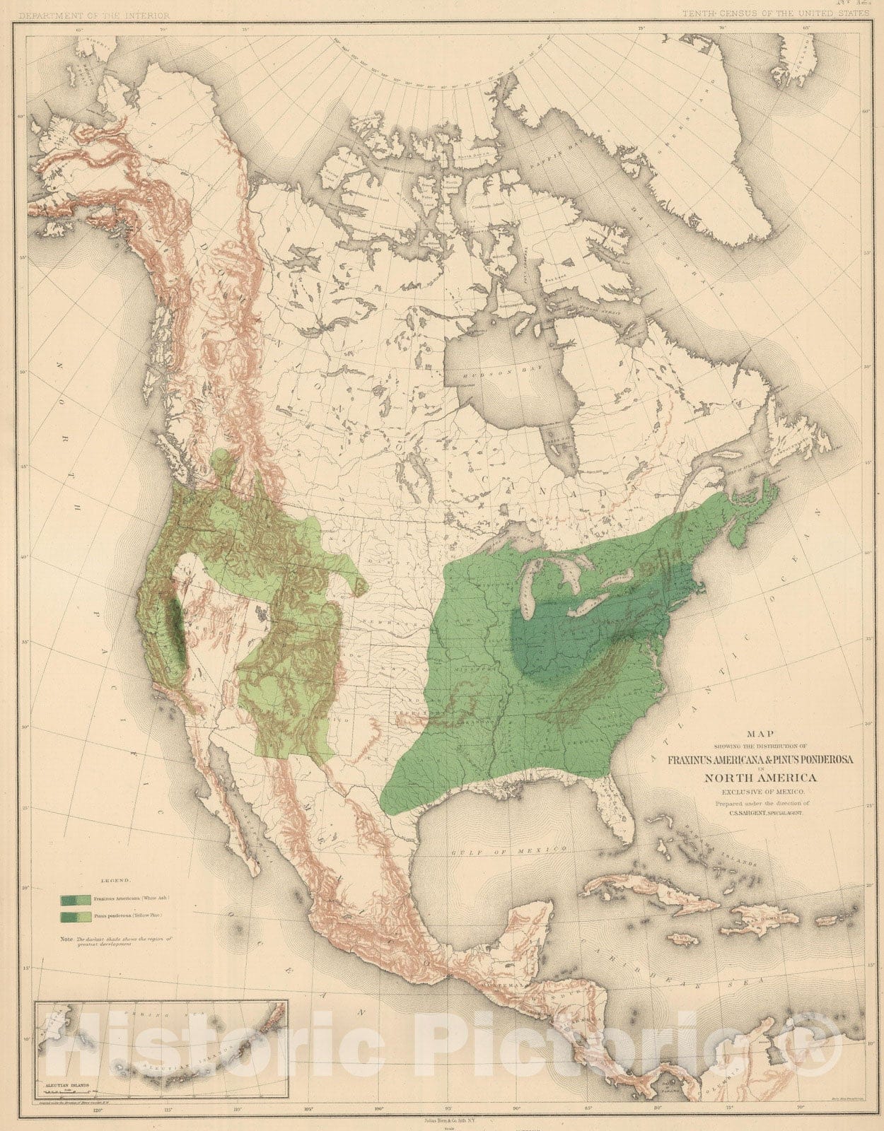 Historic Map : 1884 Distribution of Fraxinus Americana & Pinus Ponderosa in North America. - Vintage Wall Art