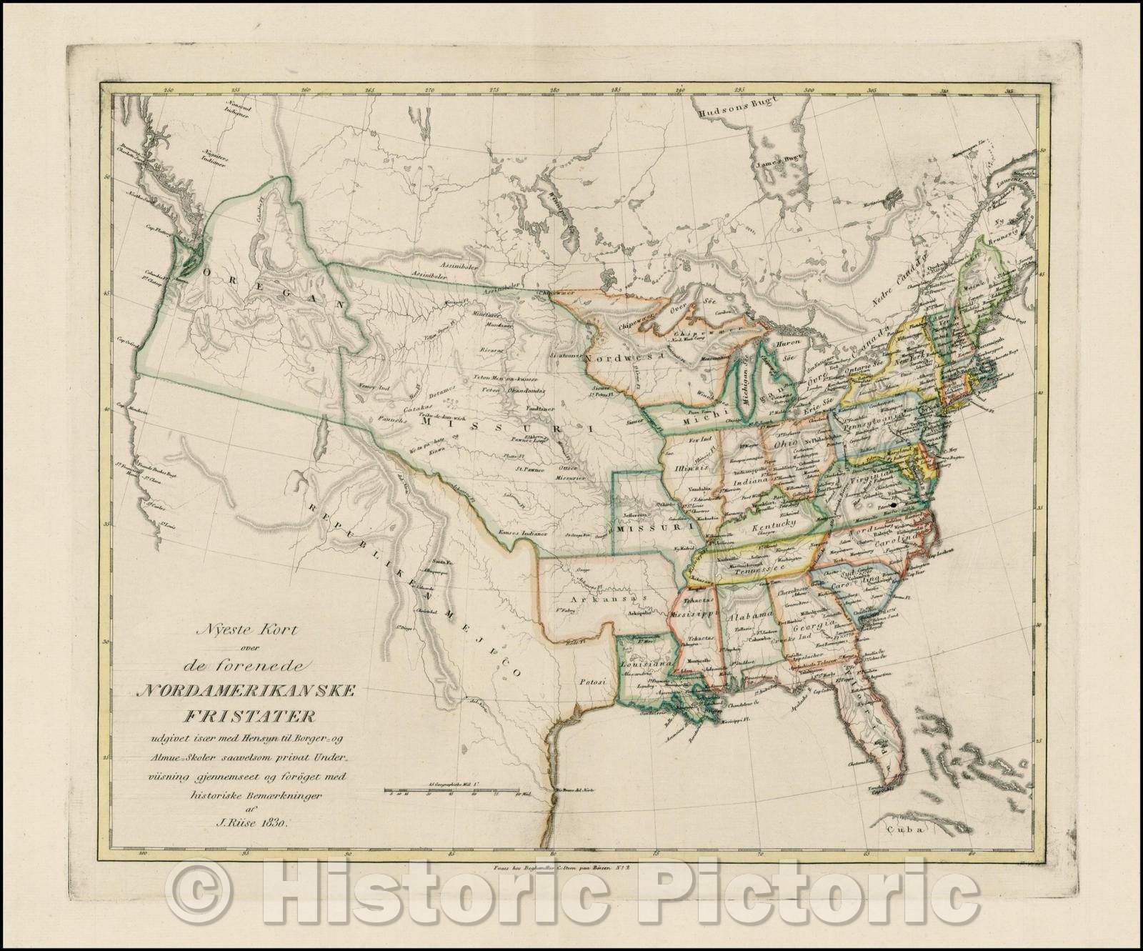 • .Historic Map - Nyeste Kort over de Forenede Nordamerikanske Fristater/Latest Map of the United North American free states. 1830, 1830, J. Riise - Vintage Wall Art