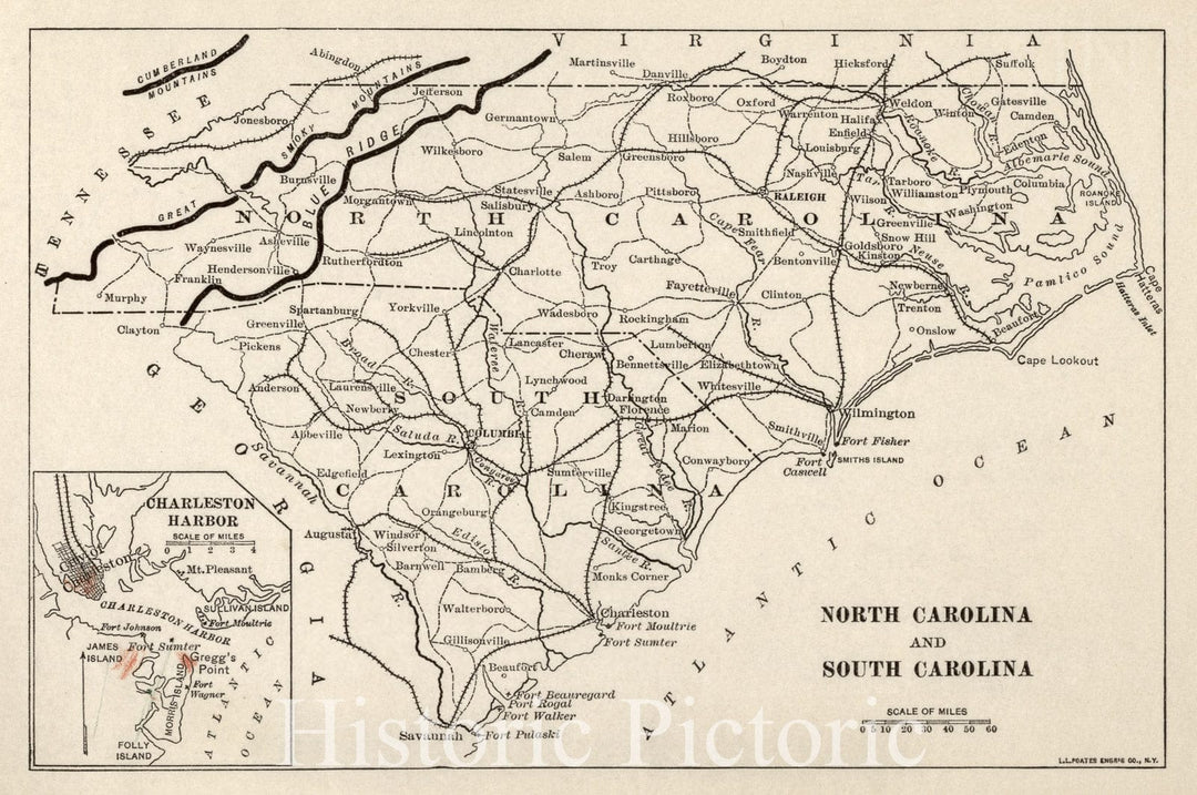 Historic 1914 Map - Campaigns of The American Civil War-Atlas - North Carolina and South Carolina - American Civil War Atlas