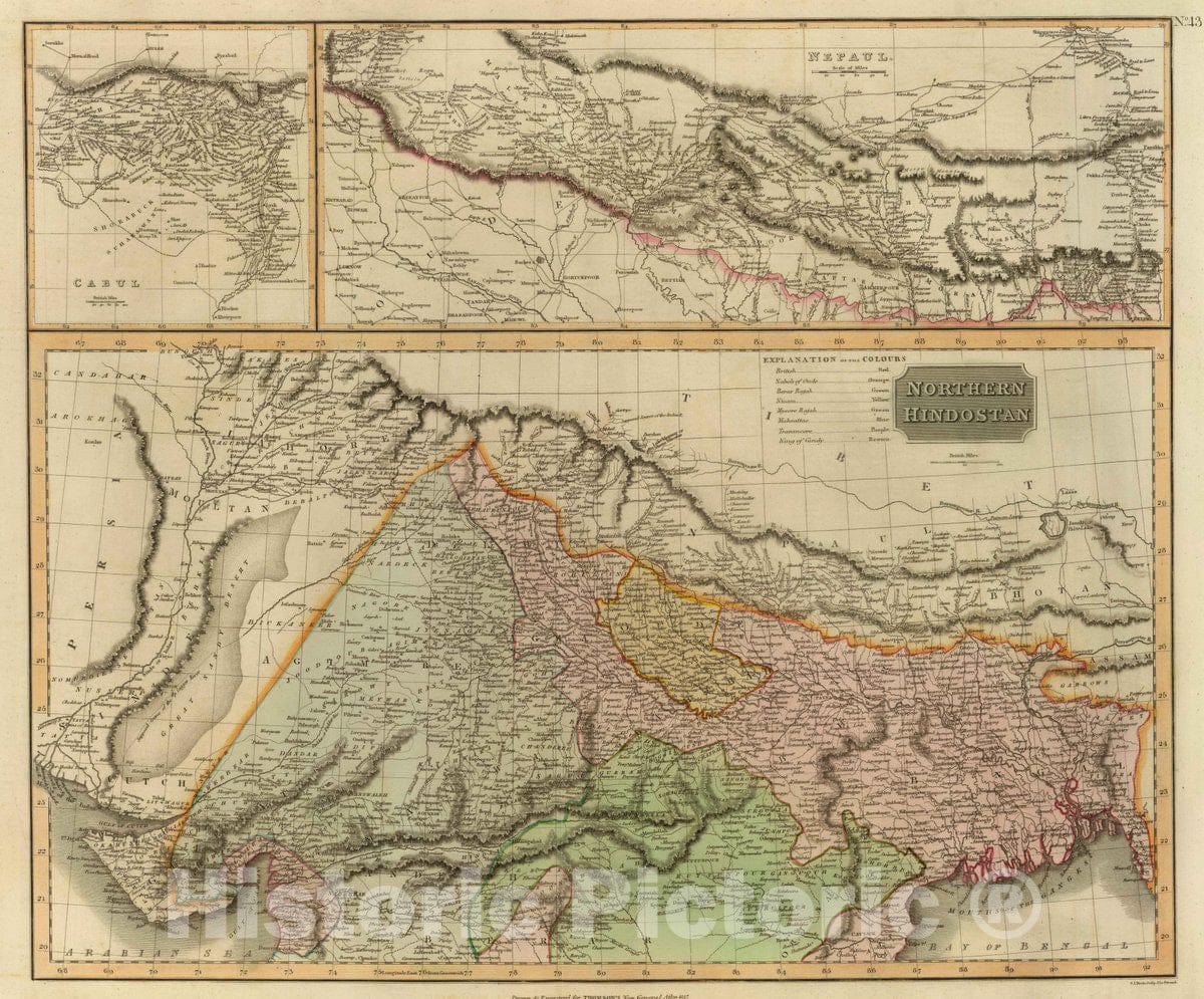 • .Historic Map : India; Nepal, South Asia Northern Hindostan. Cabul. Napaul., 352 Strand. 1817, Vintage Wall Art