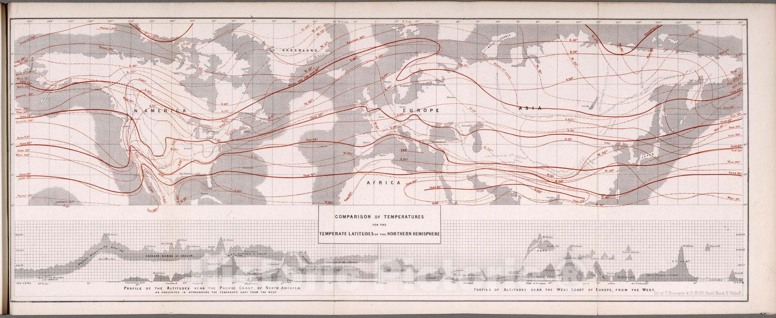 Comparison of temperatures for the temperate latitudes of the Northern Hemisphere. (with) Profile of the altitude near the Pacific Coast of North America. (with) Profile of altitude near the West coast of Europe, from the west. Lit. of F. Bourquin & Co., No. 50 South Third St. Philada. (to accompany) Climatology of the United States ...1857. | Climatology of the United States, And of the Temperate Latitudes of the North American Continent. ... By Lorin Blodget ... Philadelphia: J.B. Lippincott and Co. Trubner and Co.; London. 1857. (on verso) Entered ... 1857, by Lorin Blodget ... Pennsylvania. | Sabin: "Highly eulogized by Humboldt." First important work on this subject. See DAB. Maps uncolored except for climatological information which is shown in red. Cloth covered boards with "Blodget's Climatology of the United States" on spine.