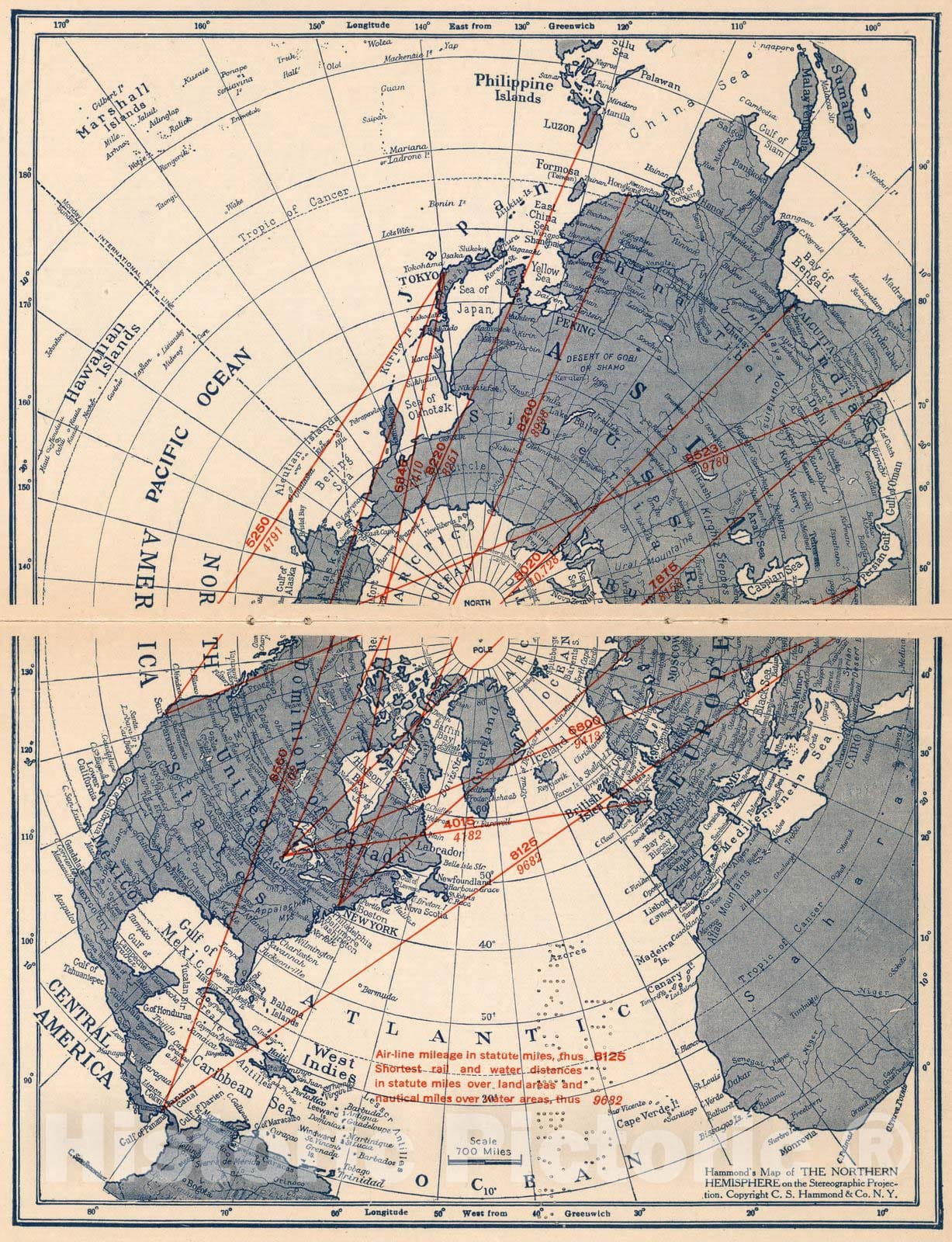 • Historic Map : World Atlas Map, Northern Hemisphere, Air-line mileage in statute miles. 1928 - Vintage Wall Art