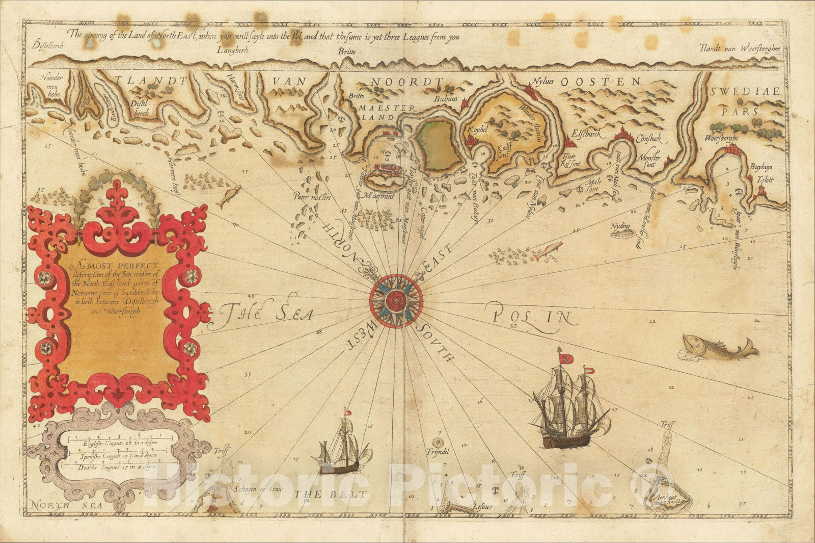 Historic Map : A Most Perfect description of the Sea coastes of the North East land parte of Norway part of Swedeland, 1588, Lucas Janszoon Waghenaer, Vintage Wall Art