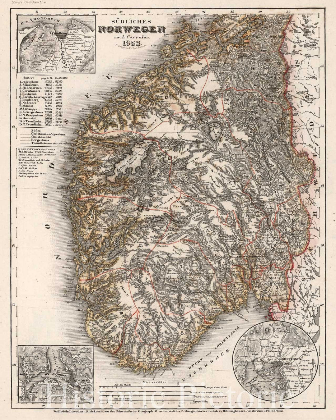 Historic Map : Norway, Sudliches Norwegen nach Carpelan, 1852 , Vintage Wall Art