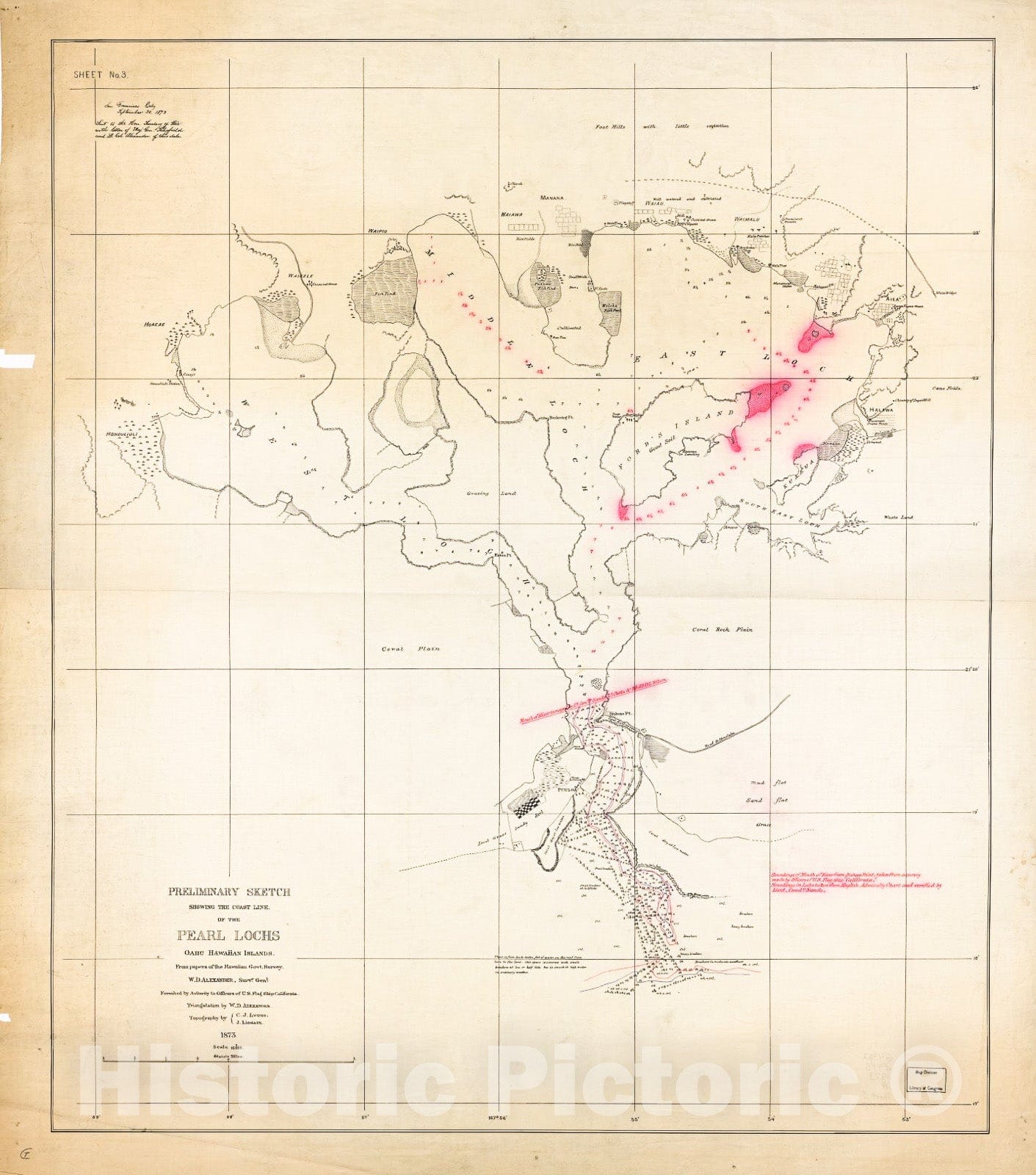 • .Historic 1873 Map - Preliminary Sketch Showing The Coast line of The Pearl Lochs, Oahu, Hawaiian Islands