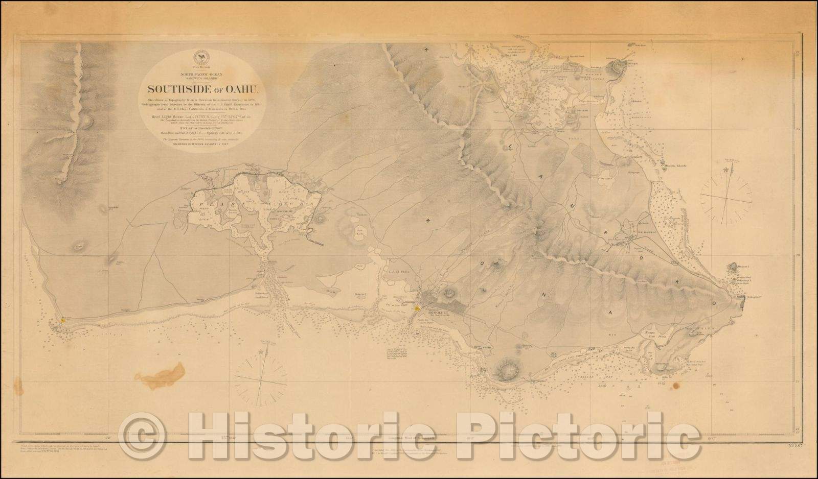 Historic Map - Southside of Oahu. Shorelines & Topography from a Hawaiian Government Survey in ; Hydrography from Surveys, 1880 - Vintage Wall Art