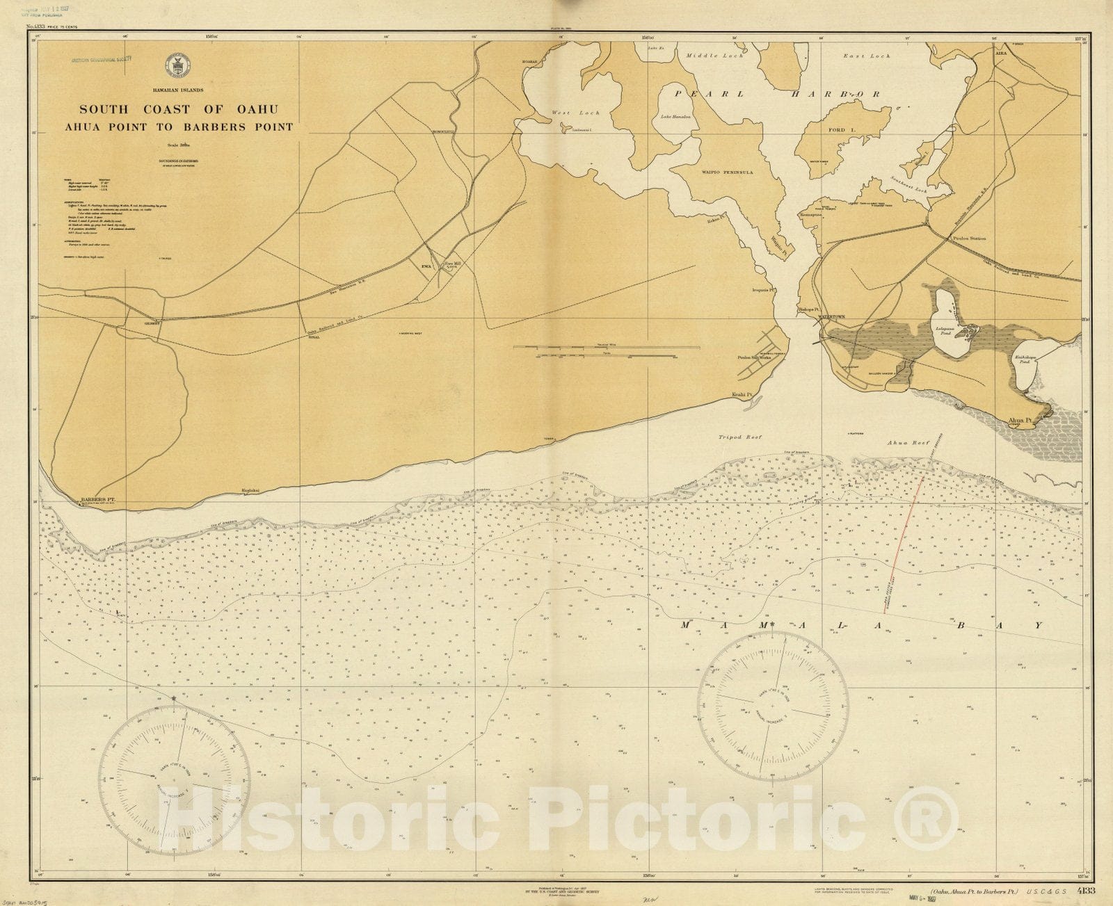 Map : Oahu, Hawaii 1927, Hawaiian Islands, south coast of Oahu, Ahua Point to Barbers Point , Antique Vintage Reproduction