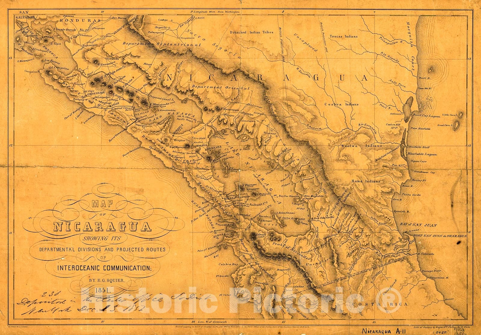 Historic 1851 Map - Map of Nicaragua Showing its departmental divisions and projected Routes of interoceanic Communication.