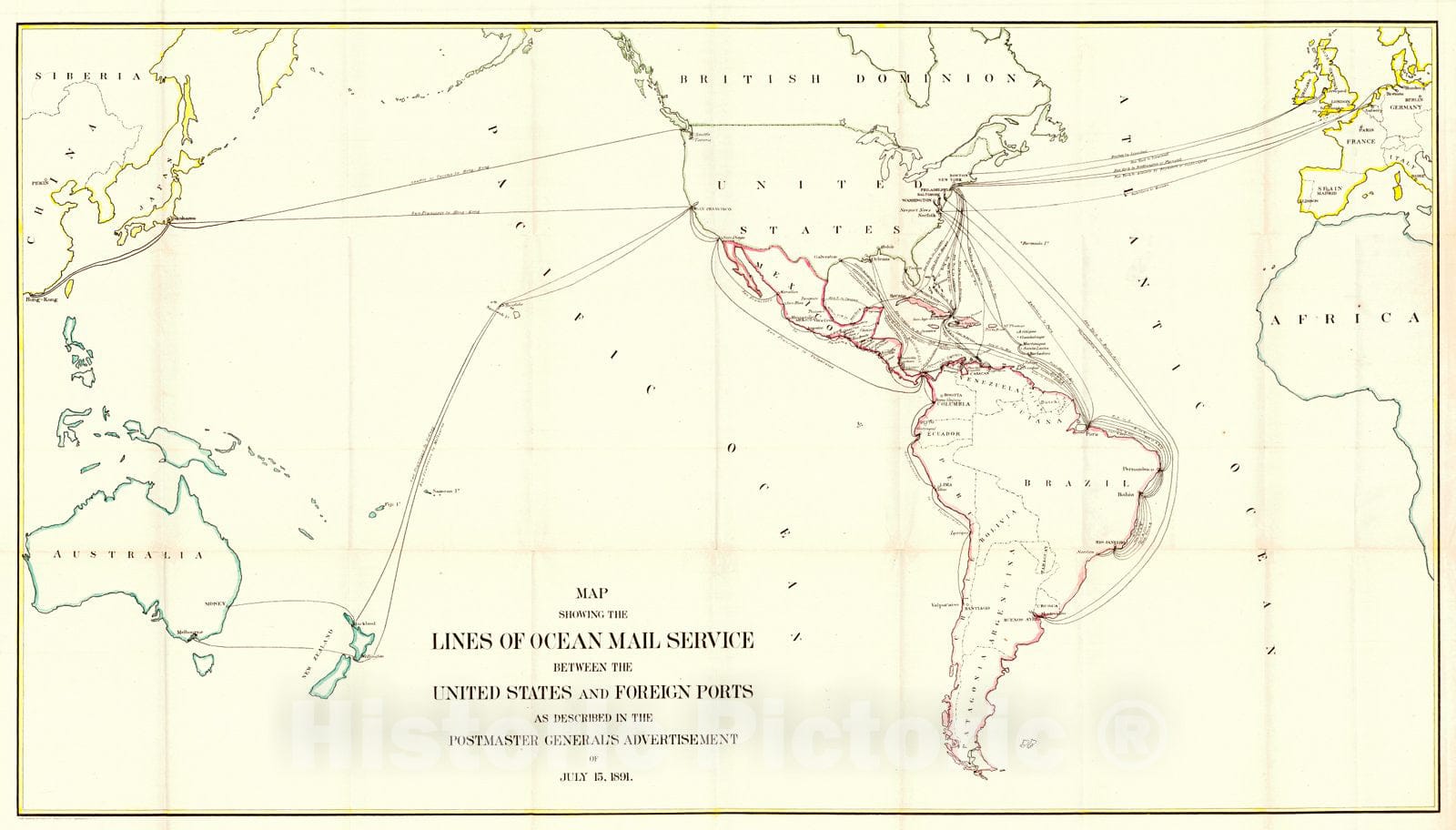Historic Map : 1891 Map Showing the Lines of Ocean Mail Service Between the United States and Foreign Ports, Postmaster General's Advertisement of July 15,1891 : Vintage Wall Art