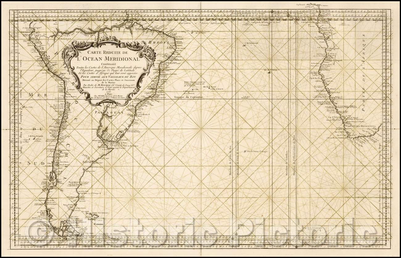 • .Historic Map - Carte Reduite De L'Ocean Meridional Contenant Toutes les Costes de l'Amerique Meridionale depus l'Equateur, 1753, Jacques Nicolas Bellin - Vintage Wall Art