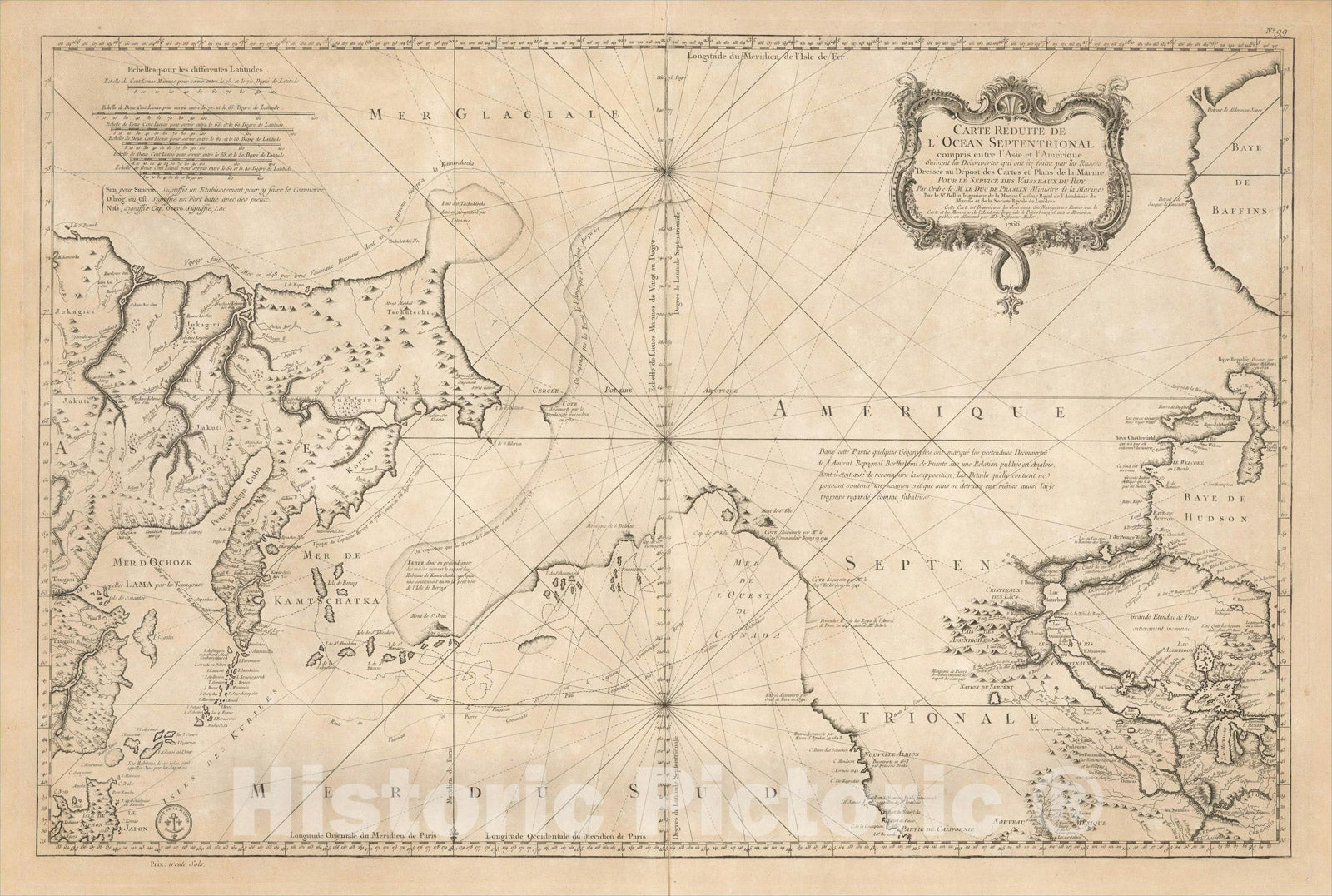 Historic Map : Carte Reduite De L'Ocean Septentrional compris entre l'Asie et l'Amerique, 1766, Jacques Nicolas Bellin, Vintage Wall Art