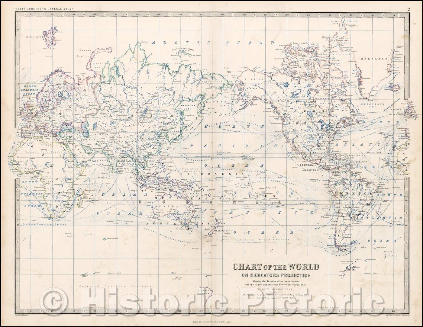 Historic Map - Chart of the World on Mercator's Projection Showing the directions of the Oceans Currents, 1860 - Vintage Wall Art