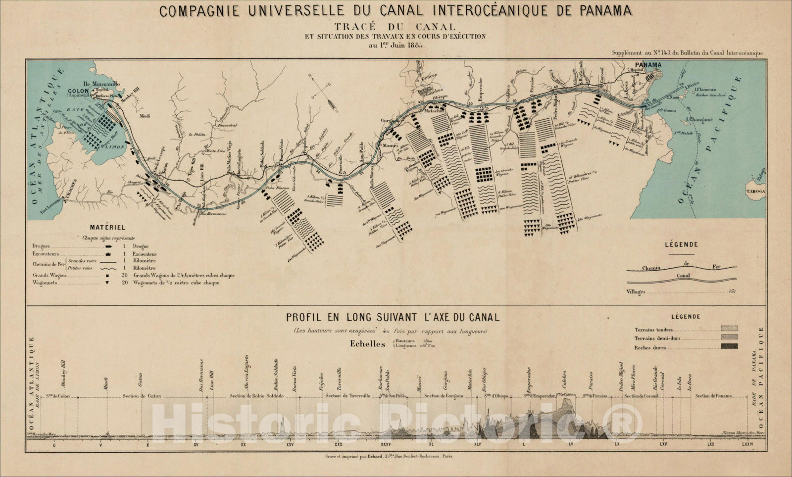 Historic Map : Compagnie Universelle Du Canal Interoceanique De Panama Trace Du Canal Et Situation Des Traveaux en Cours D'Execution au 1er Juin 1885, 1885, Vintage Wall Art