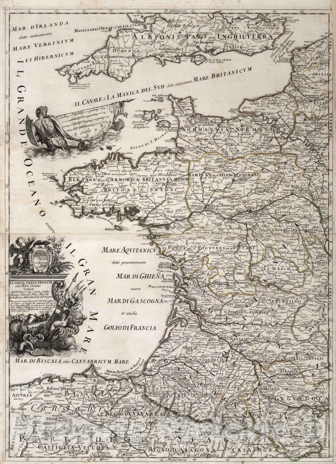 Historic Map : France, , Europe 1692 Le Coste Della Francia sul Mare Oceano , Vintage Wall Art
