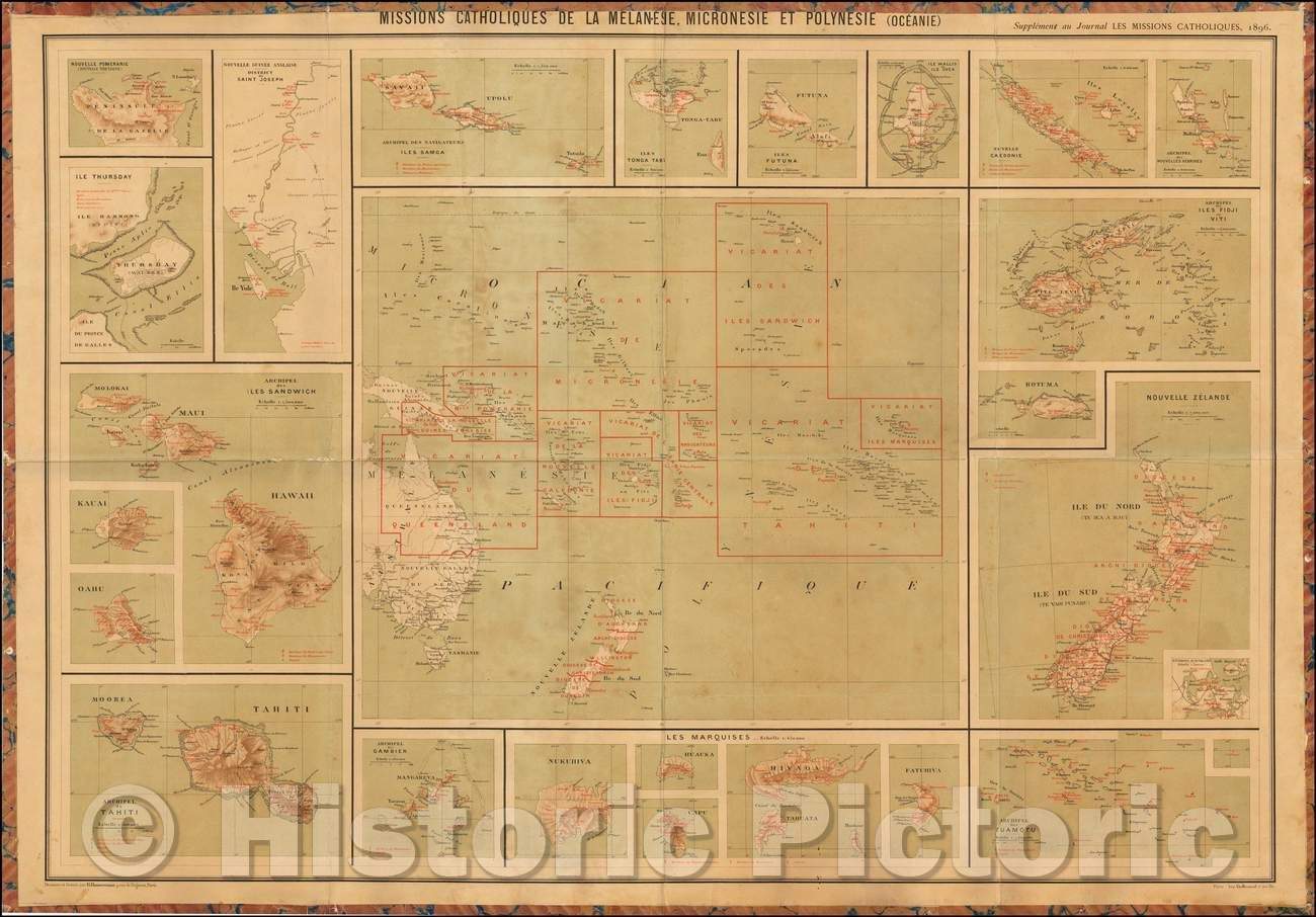 • Historic Map - Missions Catholiques De La Melanesie, Micronesie et Polynesie Oceanie, 1896, Journal Les Missions Catholiques - Vintage Wall Art