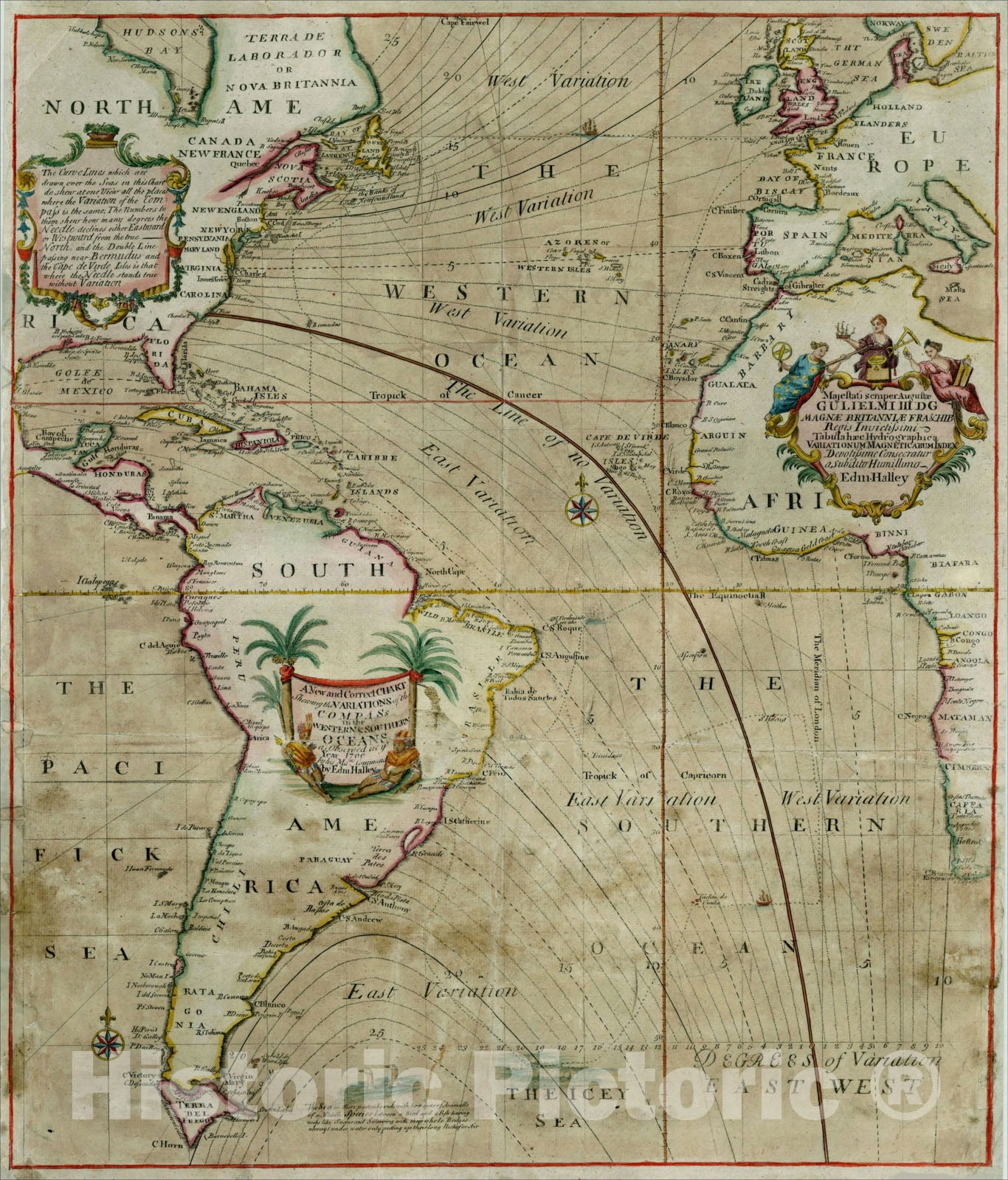 • .Historic Map : A New and Correct Chart Shewing the Variations of the Compass in the Western & Southern Oceans, 1702, , Vintage Wall Art