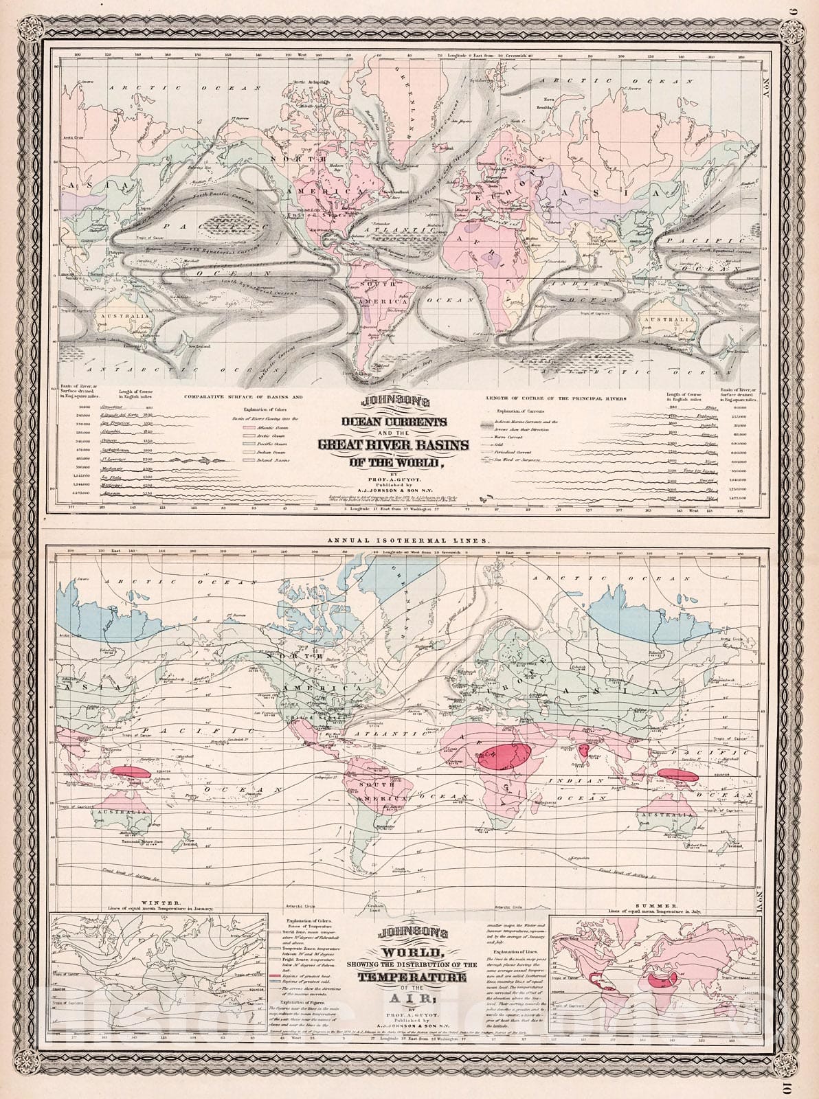 • .Historic Map : Ocean Currents, Great River Basins of the World, and Temperature of the Air, 1880, Vintage Wall Decor