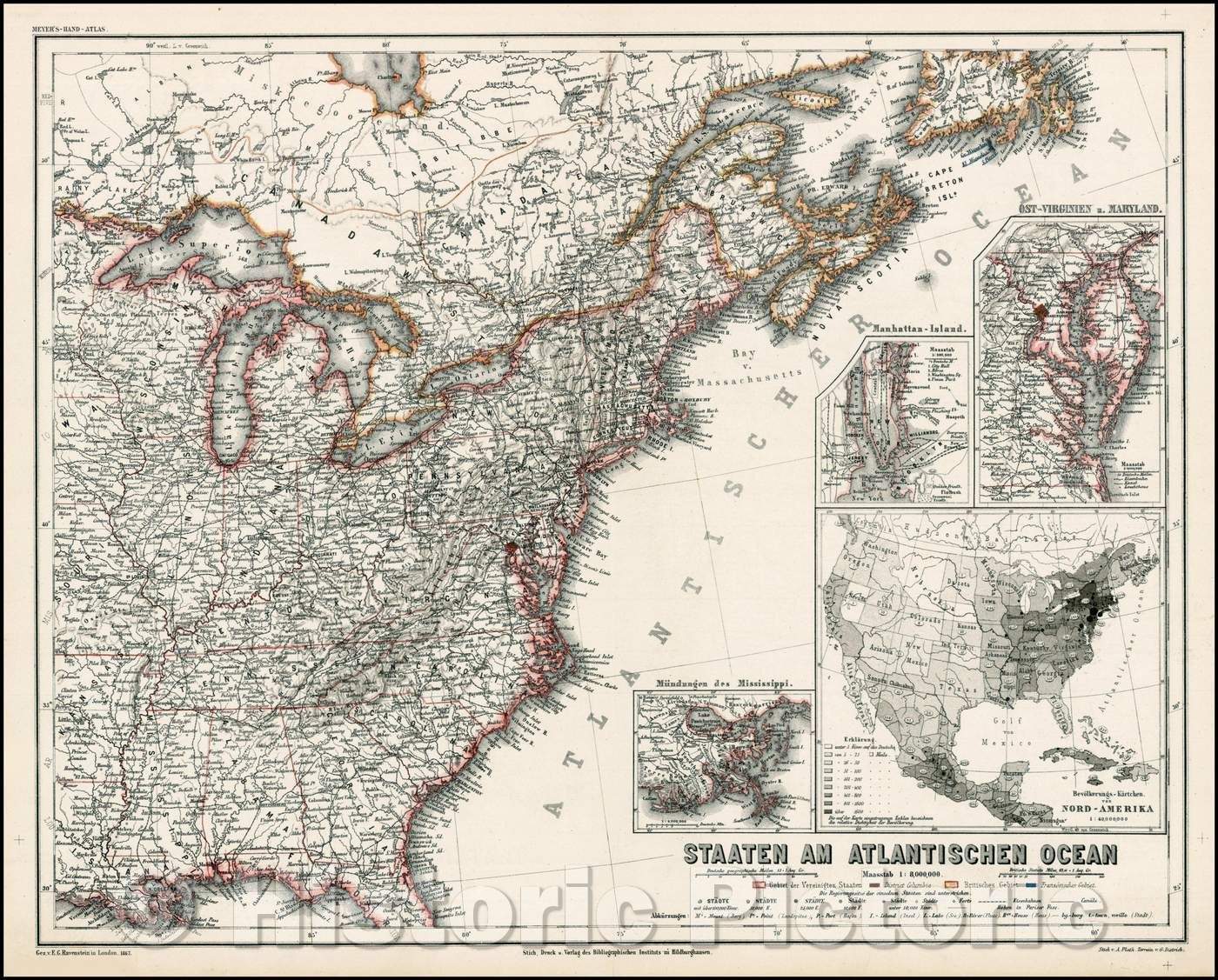 • .Historic Map - Staaten Am Atlantischen Ocean, 1867, E.G. Ravenstein - Vintage Wall Art