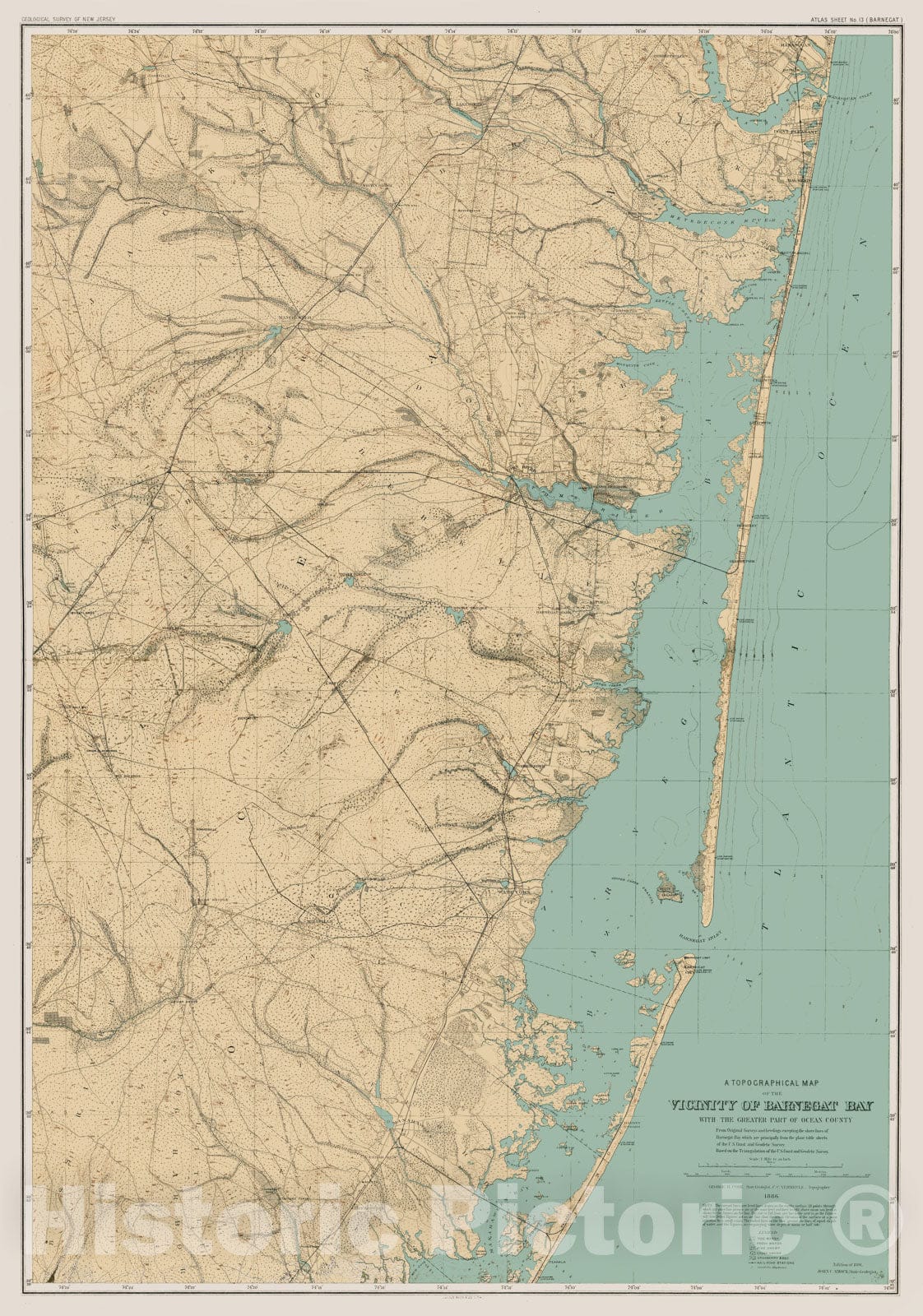 • Historic Map - A Topographical Map of the Vicinity of Barnegat Bay with hte Greater Part of Ocean County, 1886, Geological Survey of New Jersey - Vintage Wall Art