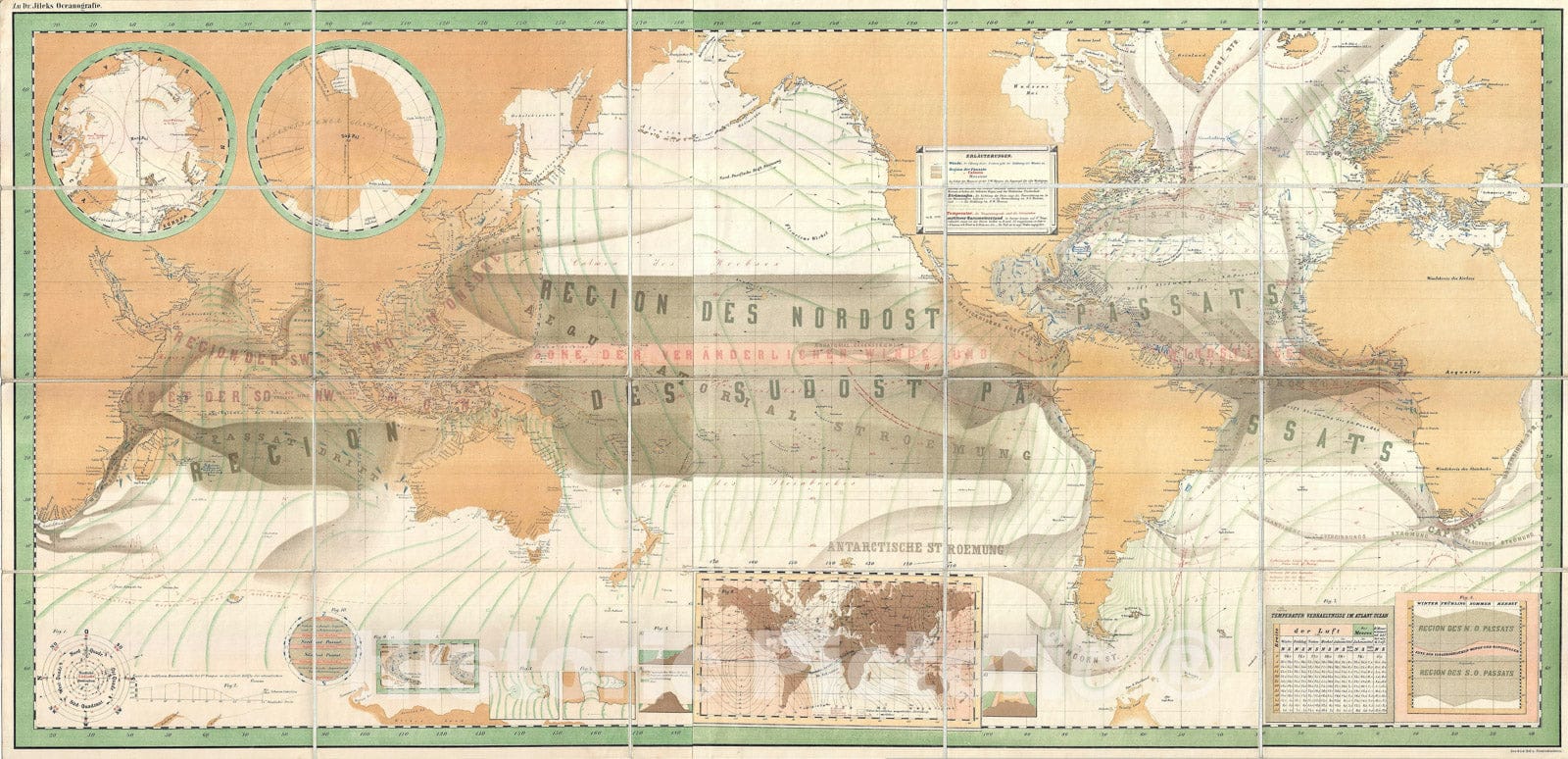 • .Historic Map : The World showing Ocean Currents and Winds, Jilek, 1880, Vintage Wall Art