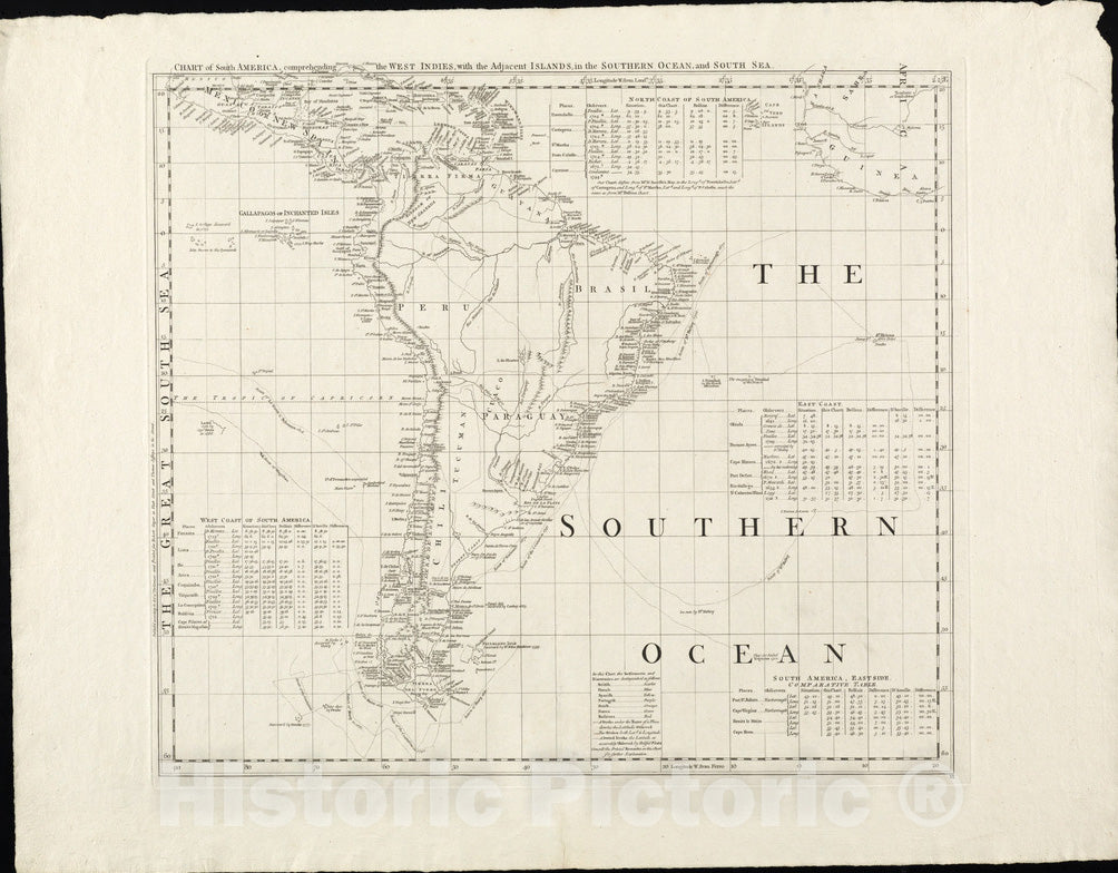 • .Historical Map, 1753 Chart of South America, comprehending the West Indies, with the adjacent islands, in the Southern Ocean, and South Sea, Vintage Wall Art