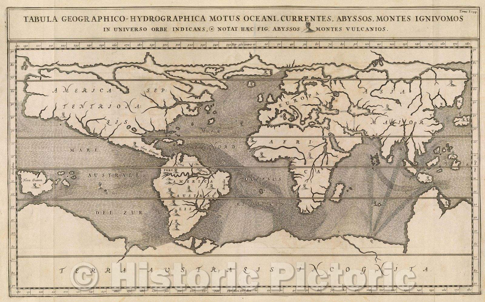 • .Historic Map : Tabula geographico-hydrographica motus oceani, currentes, abyssos, montes ignivomos in universo orbe indicans, notat haec fig. abyssos montes vulcanio, 1668 , Vintage Wall Art