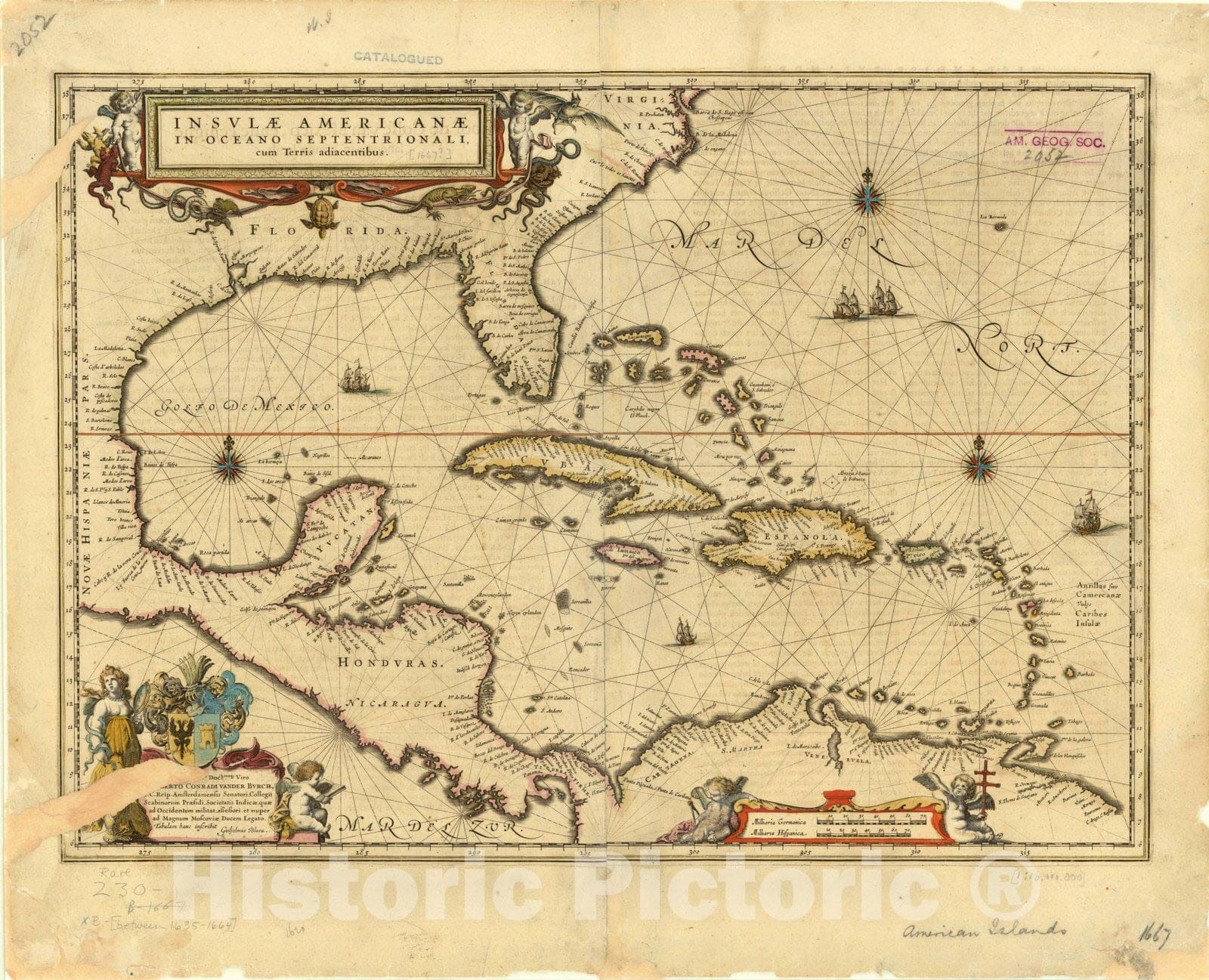 Map : West Indies between 1635-1664, Insulae Americanae in Oceano Septentrionali cum terris adiacentibus, Antique Vintage Reproduction