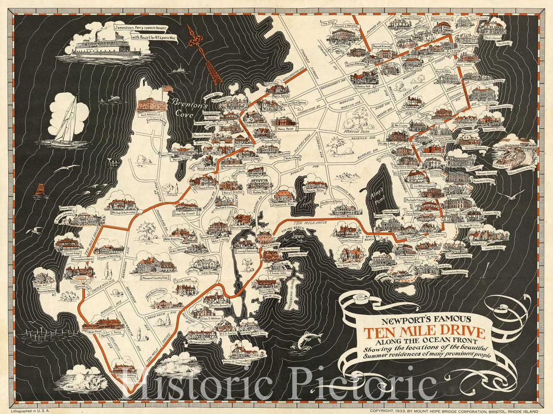Historic Map - Newport's Famous Ten Mile Drive along the Ocean Front. 1933 - Vintage Wall Art