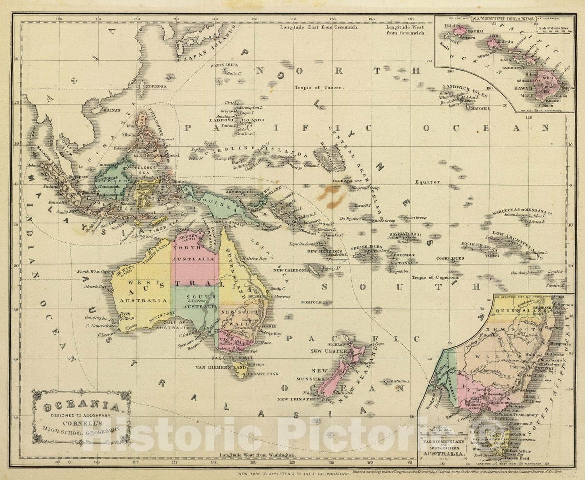 • .Historic Map : Oceania. Designed to accompany Cornell's High school geography. (with) Sandwich Islands. (with) Van Diemens Land and south eastern Australia, 1864 - Vintage Wall Art