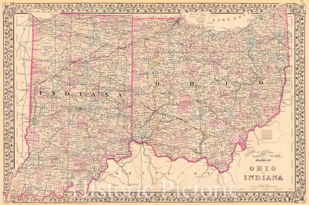 Historic Map : 1879 County & Township Map of the States of Ohio and Indiana : Vintage Wall Art
