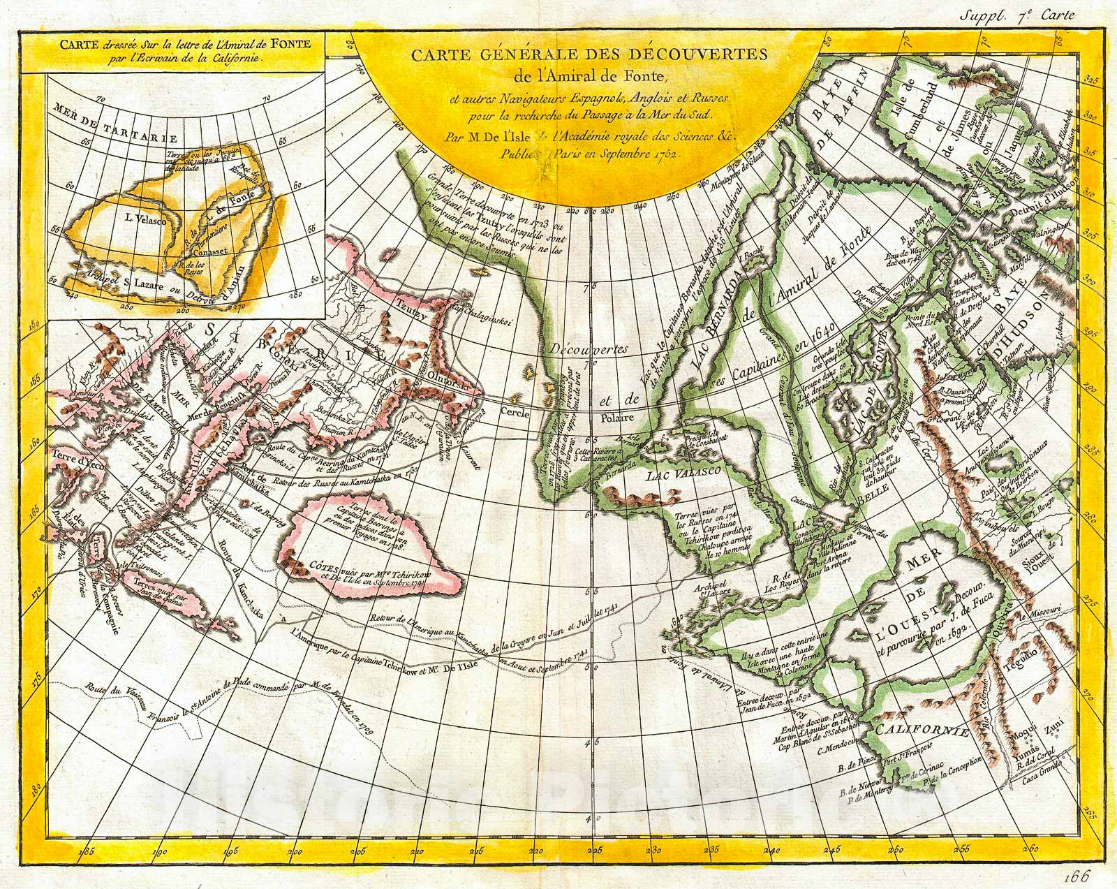 One of the most splendid combinations of hard fact and speculative fantasy to appear in the history of cartography. This map, prepared by Joseph-Nicholas de Delisle 1762 and republished by Vaugondy in 1772, covers parts of Siberia and northeastern Asia as well as the northwestern parts of the American continent, including the Hudson Bay, and the legendary Northwest Passage. Traces the routes of several important explorers, most notably Tchirikow, Frondat, Bering and De Fonte. Today, based upon inaccuracies and falsities, we know the entire De Fonte article to have been a fabrication, however, it set 18th century afire with speculation that a Northwest Passage must indeed exist. When Joseph-Nicolas Delisle, younger brother of the better known Guillaume Delisle, returned from his tenure at Russian Tzar Peter the Great’s “Academy of Sciences” he decided to publish a compilation of secret cartographic data obtained from previously unknown Russian expeditions to Kamtschaka and the coast of Siberia. These seminal explorations included the discoveries of Tchirikow, Frondat, Bering, among others. He produced a ground breaking and largely accurate mapping of the peninsula of Kamchatka and the coast of northeast Asia. Dominating the northern part of the map is a great Arctic continent which blocks any further potential for a northwest passage to the north. These two disparate cartographic interpretations of the De Fonte story inspired considerable debate among European intellectual circles until the matter was finally put to rest by the expeditions of James Cook.