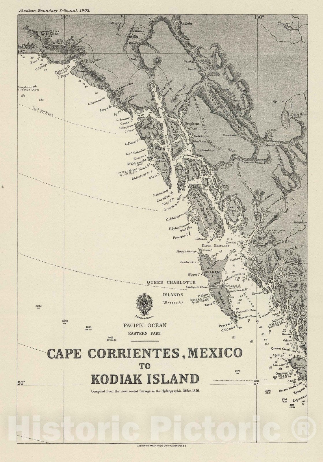 • .Historic Map : 1877 Pacific Ocean Eastern Part (portion), Cape Corrientes, Mexico to Kodiak Island. - Vintage Wall Art