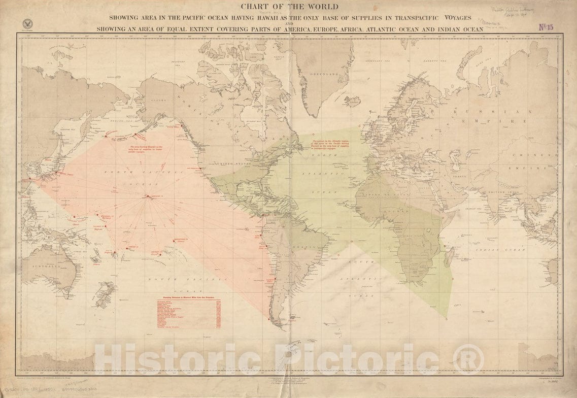 Historical Map, 1897 Chart of The World Showing Area in The Pacific Ocean Having Hawaii as The only Base of Supplies in transpacific Voyages, Vintage Wall Art