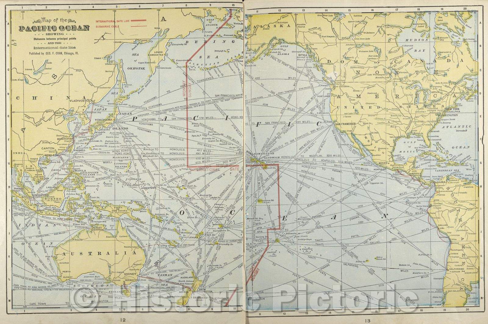 Historic Map : Map of the Pacific Ocean showing distances between principal points and the International Date Line., 1904 , Vintage Wall Art