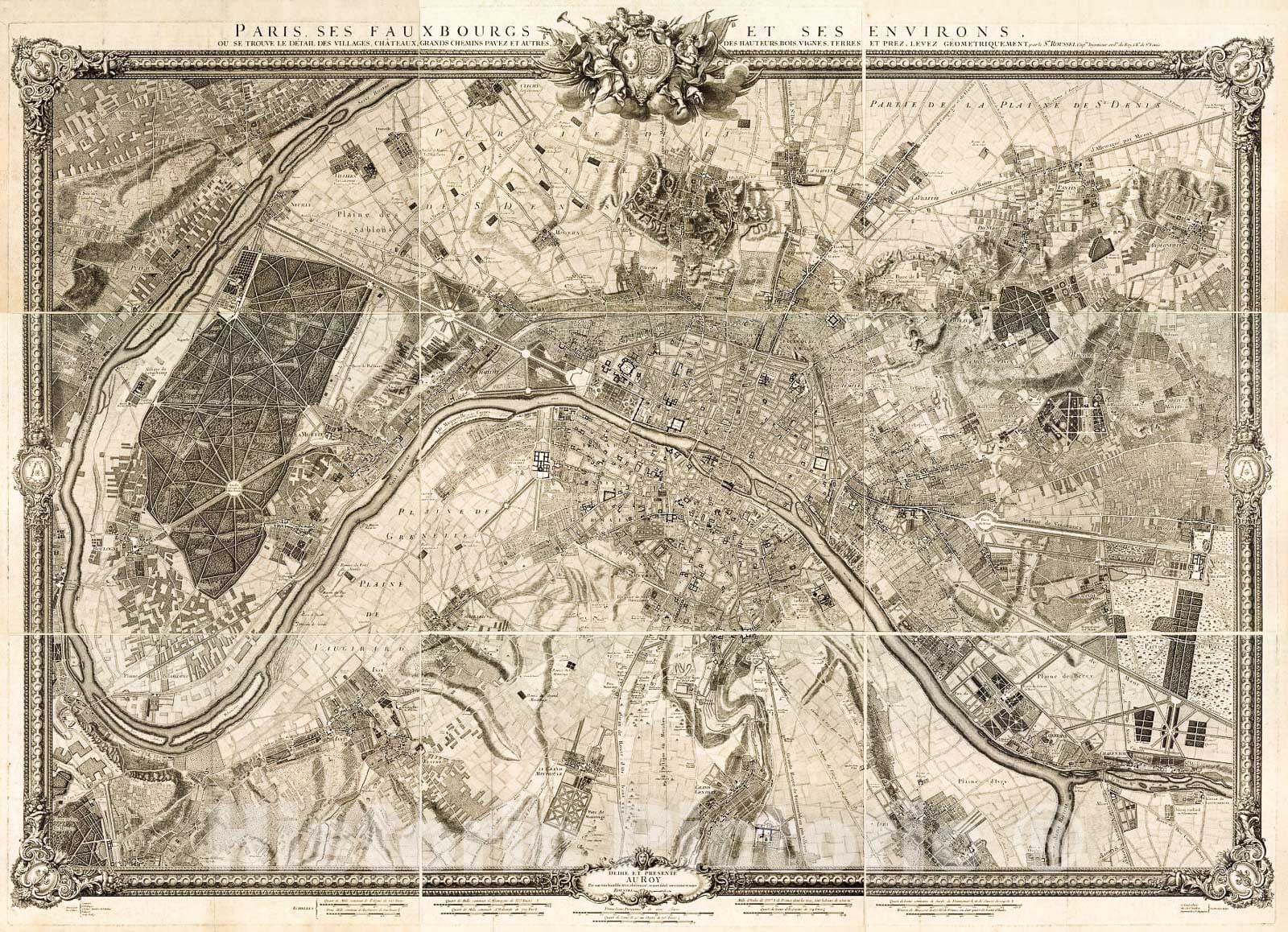 • Historic 1731 Map - Paris, SES fauxbourgs et SES Environs : où se trouve le détail des Villages, châteaux, gands chemins pavez, et autres, des hauteurs, Bois, vignes, terres, et Prez