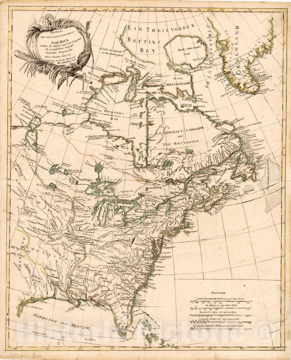 Historic 1777 Map - EIN Theil des Mitternaechtlichen America : Welcher die Besitzungen der Englaender : in denselben begreist nach dem Original des Herr'n Bonne, Paris 1773.