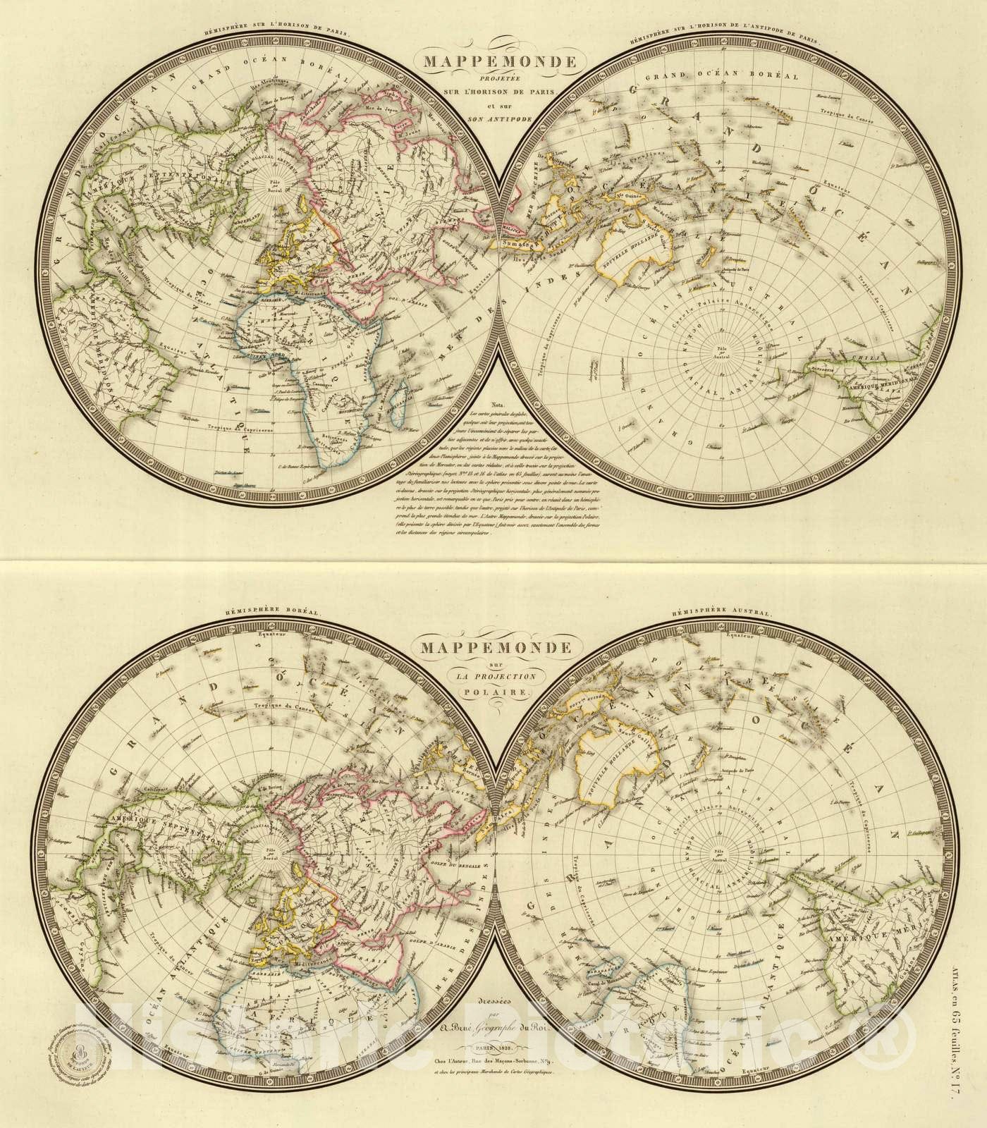 Historic Map : 1828 Mappemonde, sur l'horizon de Paris; Mappemonde sur la Projection Polaire. - Vintage Wall Art
