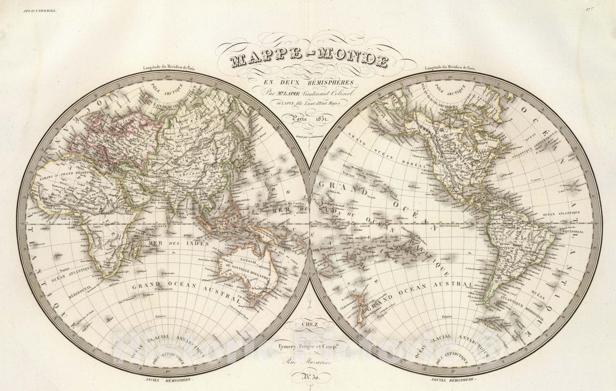 Historic Map : 1831 World - Mappe-monde en deux hemispheres. Par Mr. Lapie, Lieutenant Colonel et Lapie fils, Lieut. d'Etat Major. Paris, 1831. - Vintage Wall Art