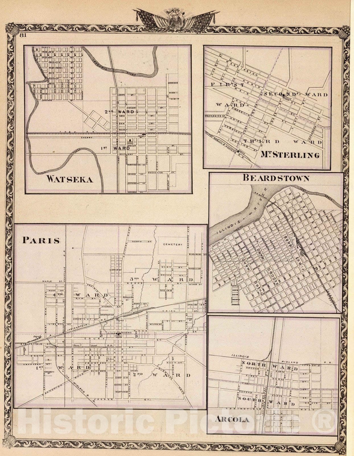 Historic Map : 1876 Watseka, Paris, Mt. Sterling, Beardstown and Arcola. - Vintage Wall Art