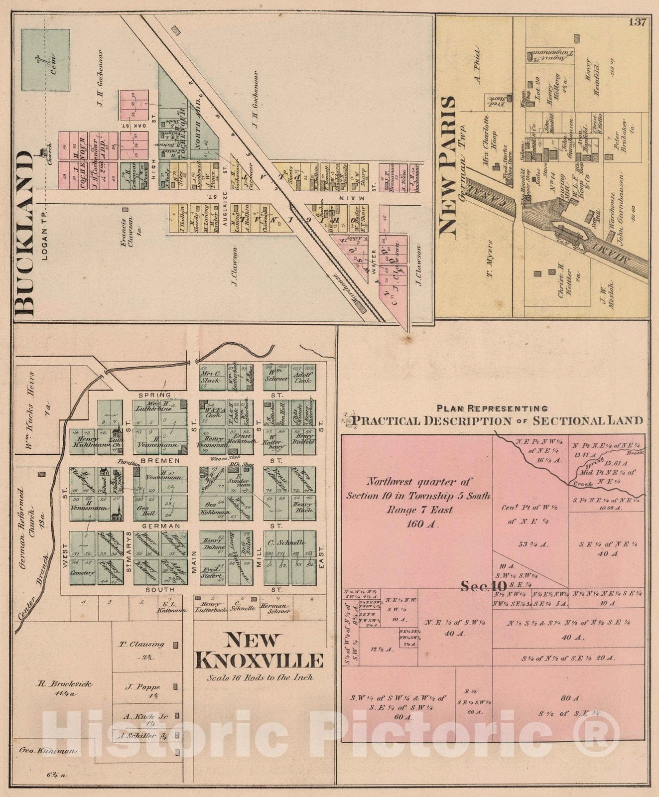 Historic Map : 1880 New Knoxville. Plan of Sectional Land. Buckland. New Paris, Auglaize County, Ohio. - Vintage Wall Art