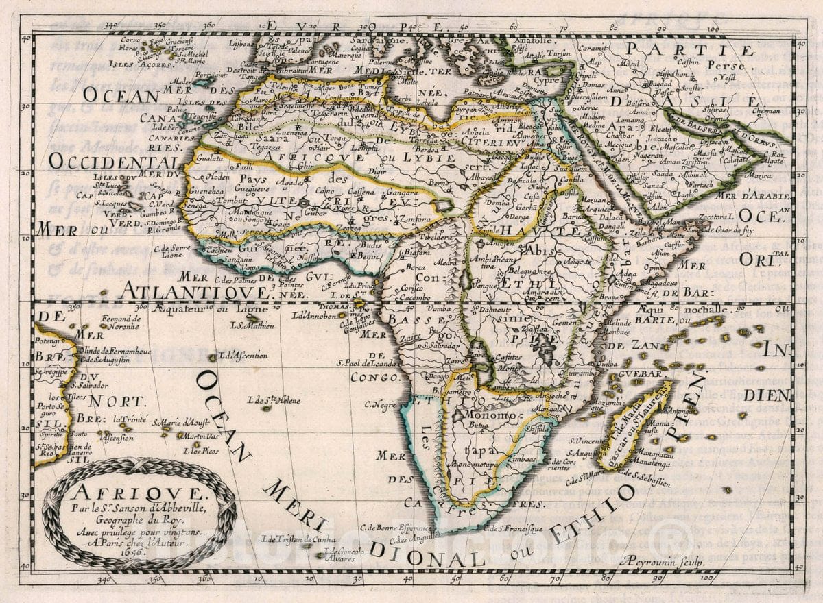 Historic Map : Afrique. Par le Sur. Sanson d'Abbeville, Geographe du Roy. Avec privilege pour vingtans. A Paris chez l'Autheur. 1656. A. Peyrounin sculp, 1656 AtlasVintage Wall Art